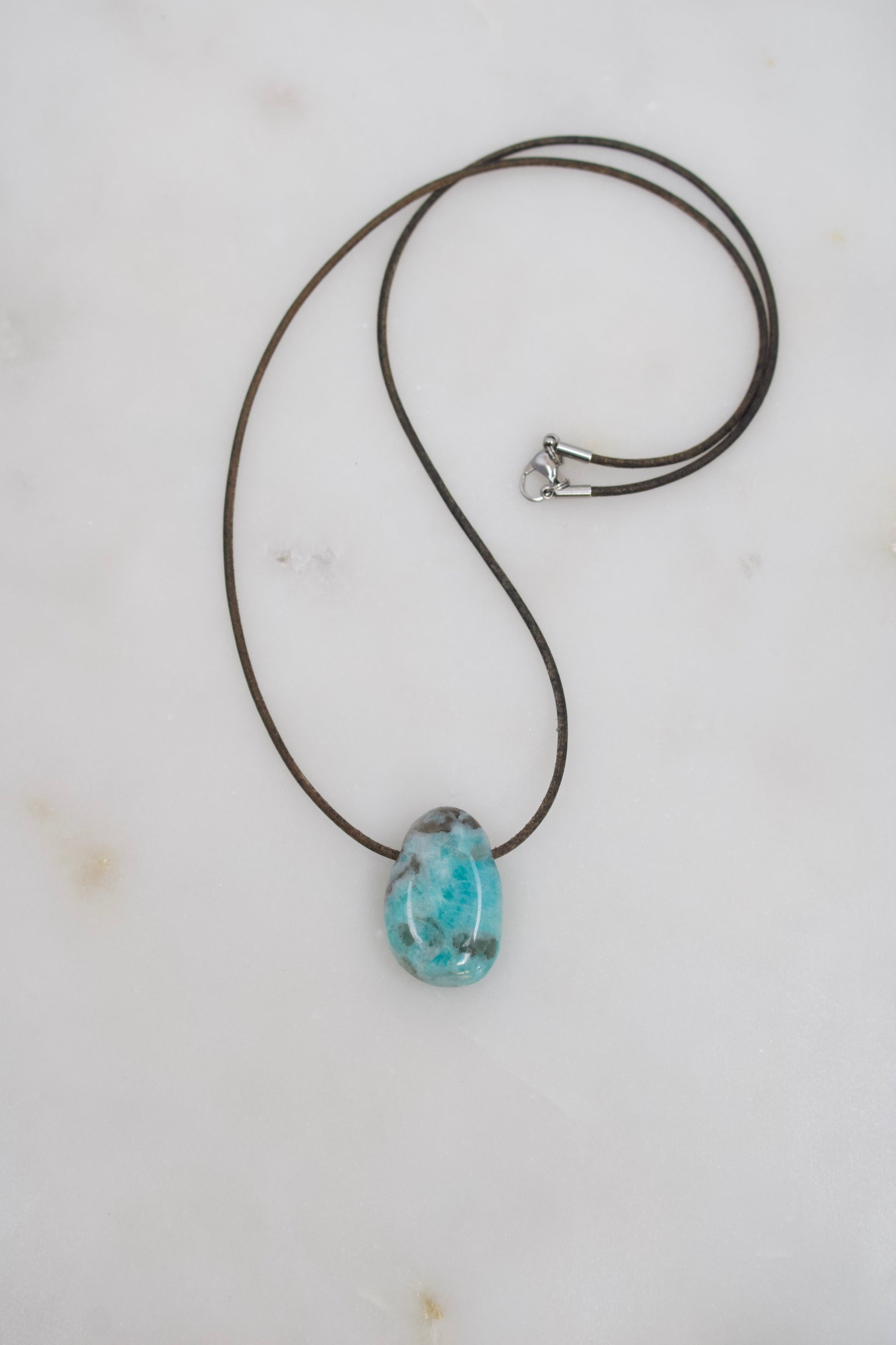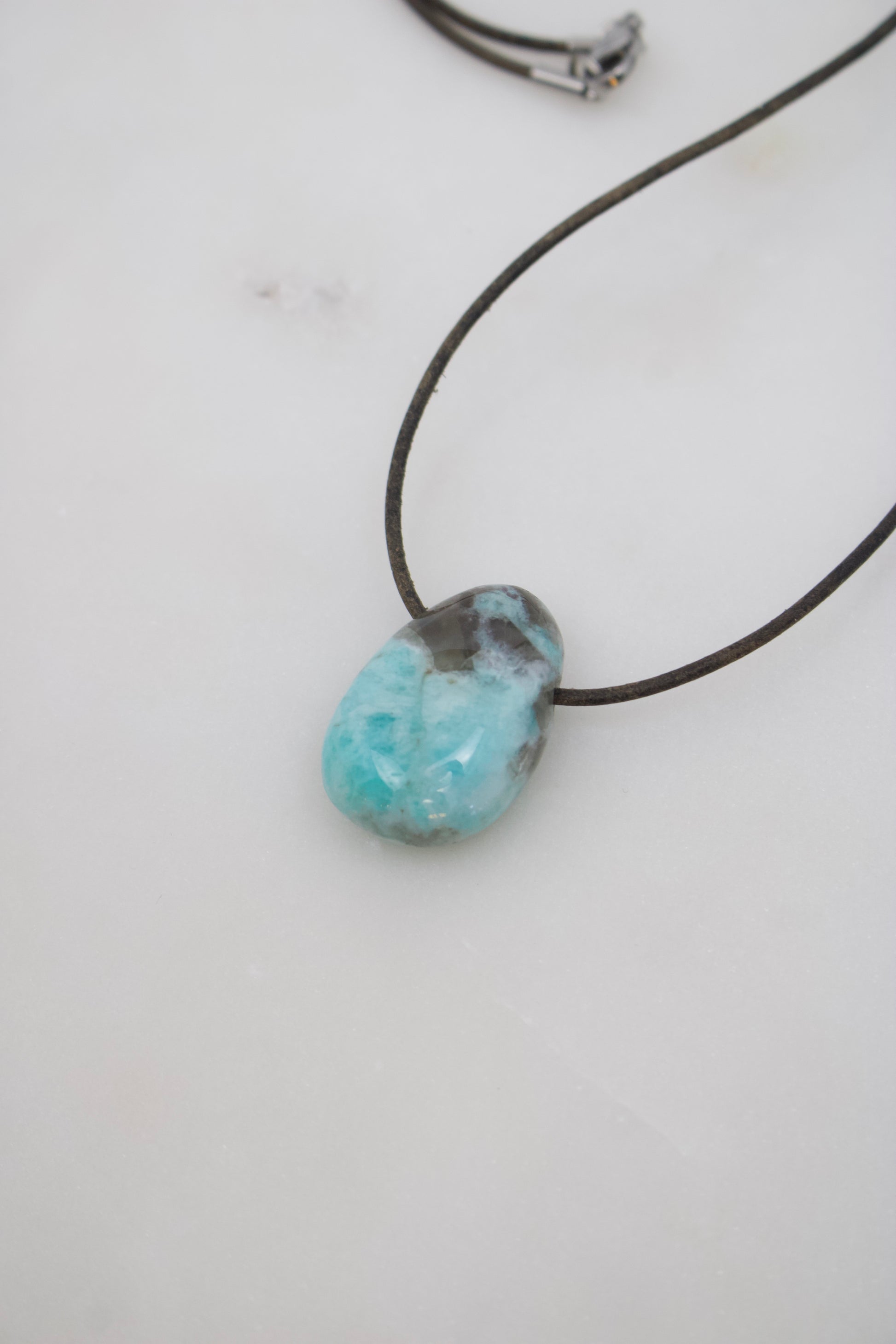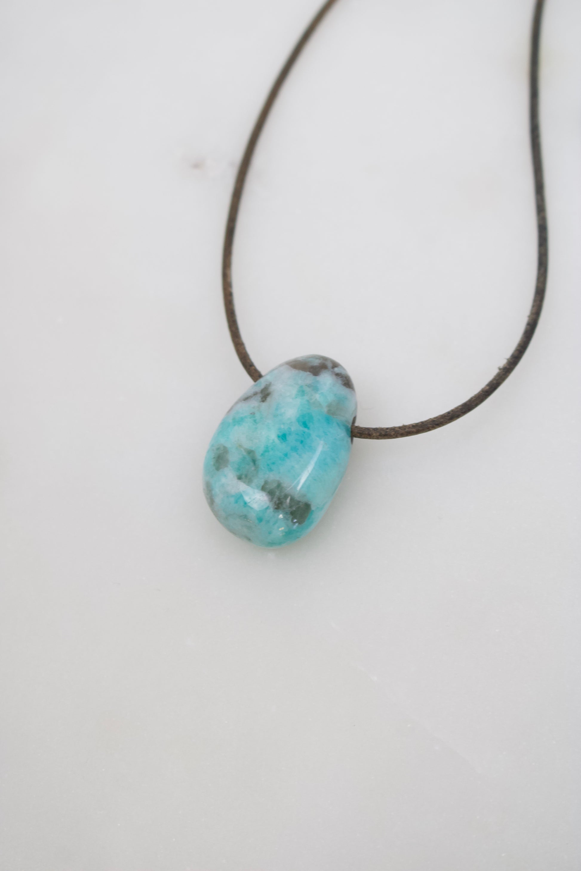 Amazonit-Anhänger mit schwarzem Turmalin · 28,7 mm · Lederband nach Wahl