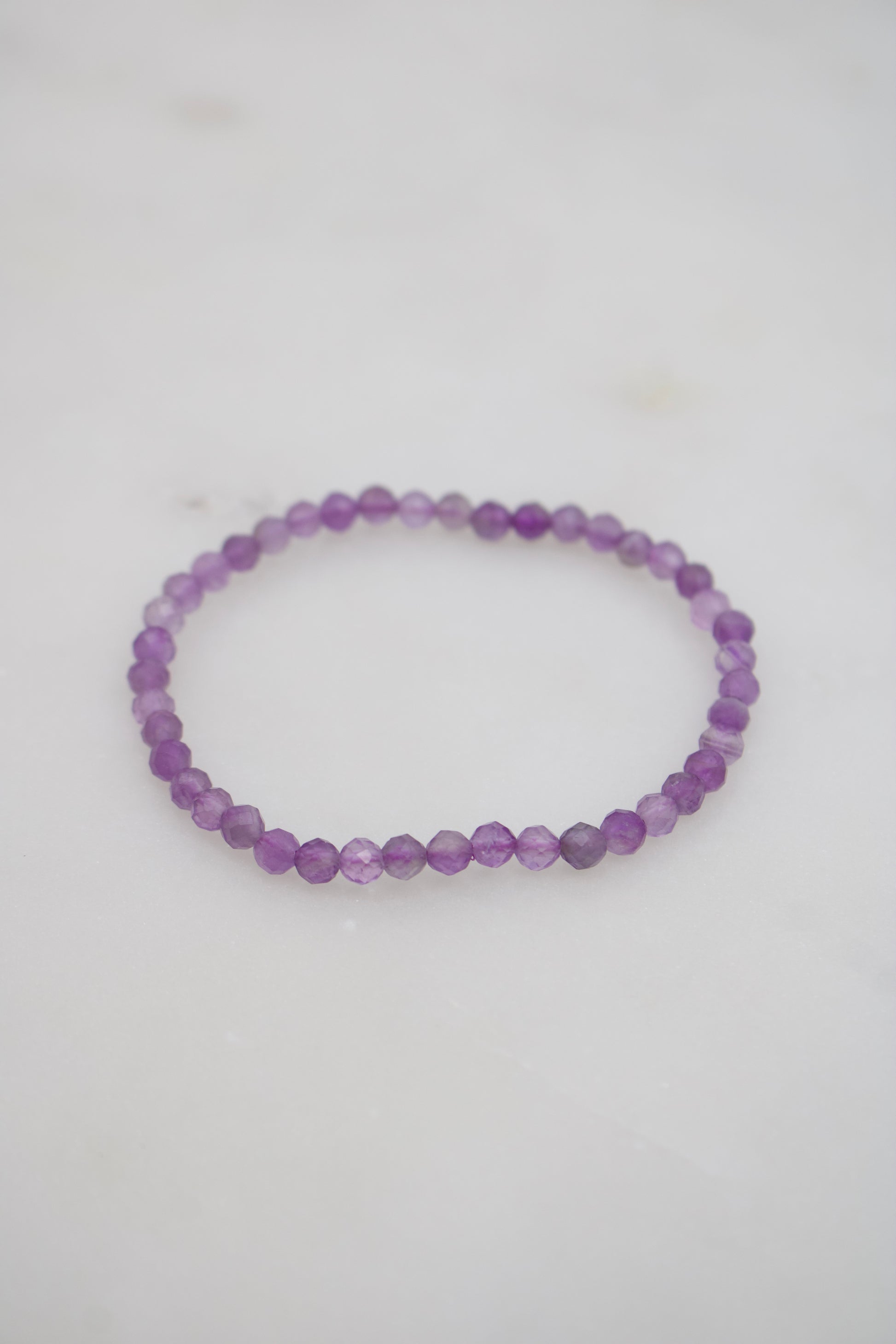 Dieses feine Armband aus 4 mm facettierten Amethyst-Perlen strahlt mit seinen tiefvioletten Facetten eine ruhige und zugleich edle Aura aus. Der Amethyst bringt mit seinem klaren, intensiven Farbspiel ein Gefühl von Ausgeglichenheit und zeitloser Schönheit an dein Handgelenk.