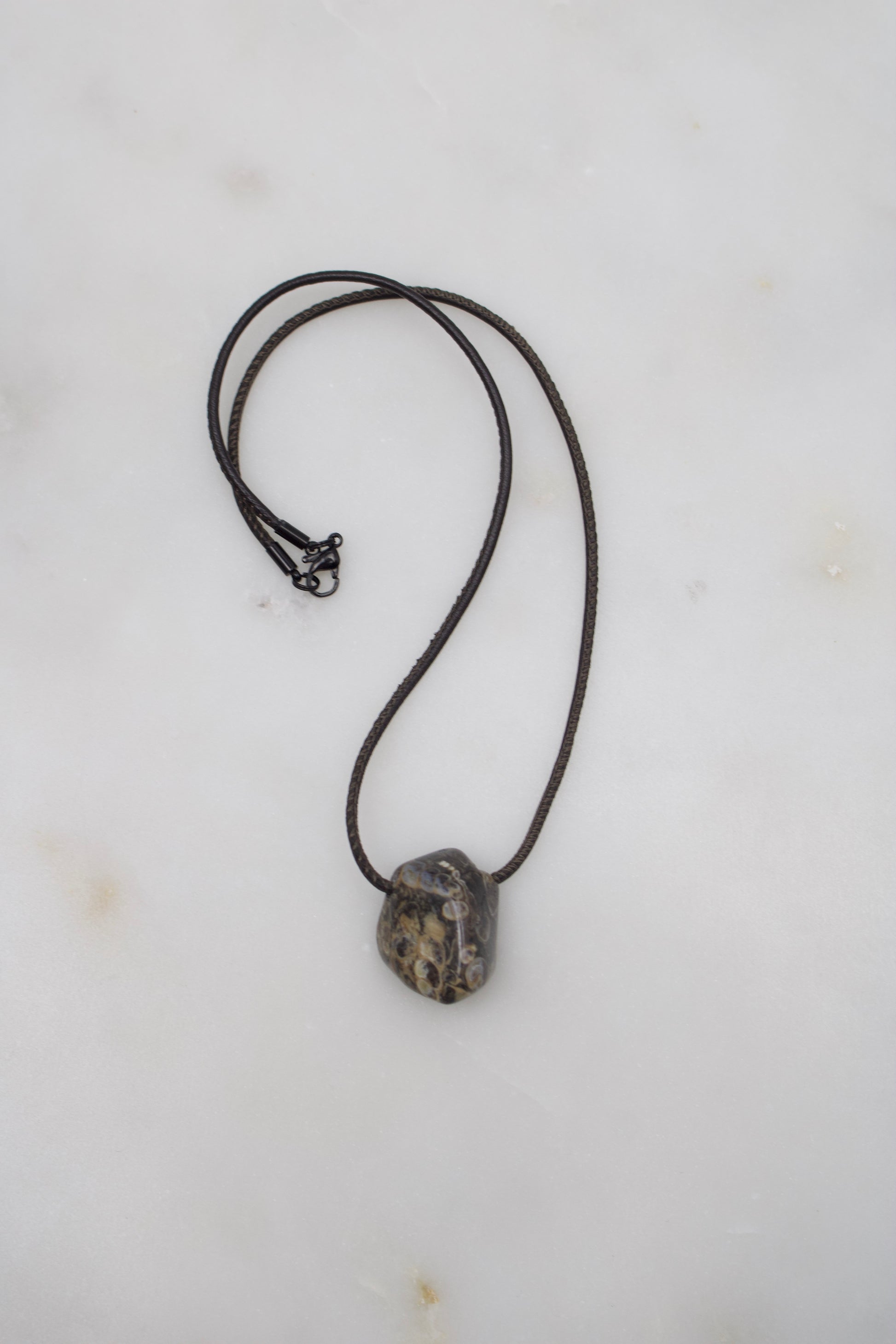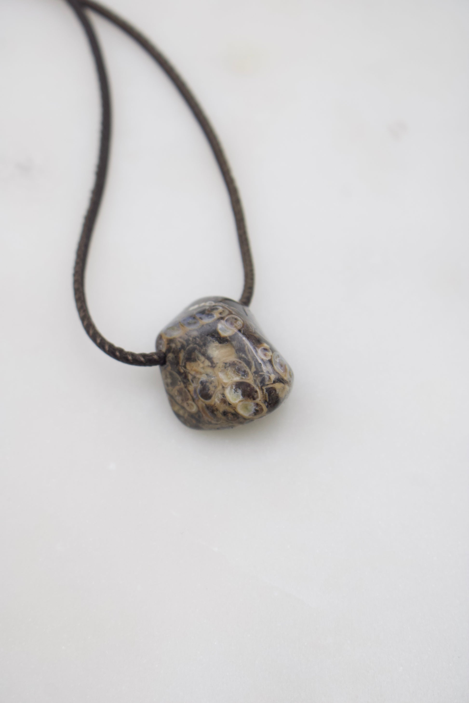 Dieser 28 mm große Turritella-Fossil-Anhänger besticht durch seine einzigartigen, spiralförmigen Muschelabdrücke, die sich deutlich im dunklen Gestein abzeichnen. Die naturbelassenen Fossilstrukturen verleihen dem Anhänger eine faszinierende Tiefe und erzählen von Jahrmillionen alter Geschichte – ein echtes Stück Erdzeit, das man bei sich trägt.
