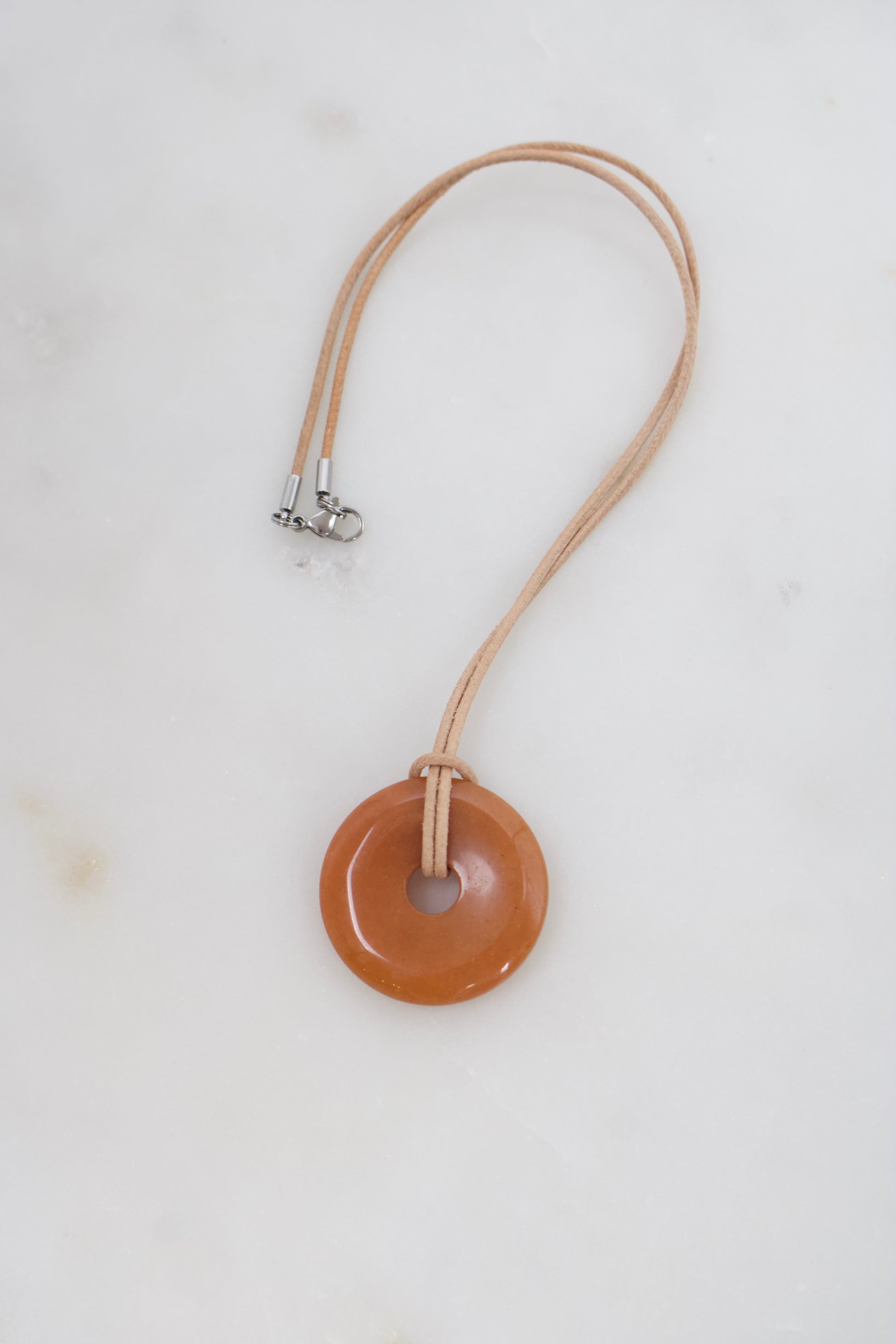Der Donut wird an einem Lederband nach Wahl getragen und durch einen Karabinerverschluss aus Edelstahl in Silber- oder Goldoptik ergänzt.
