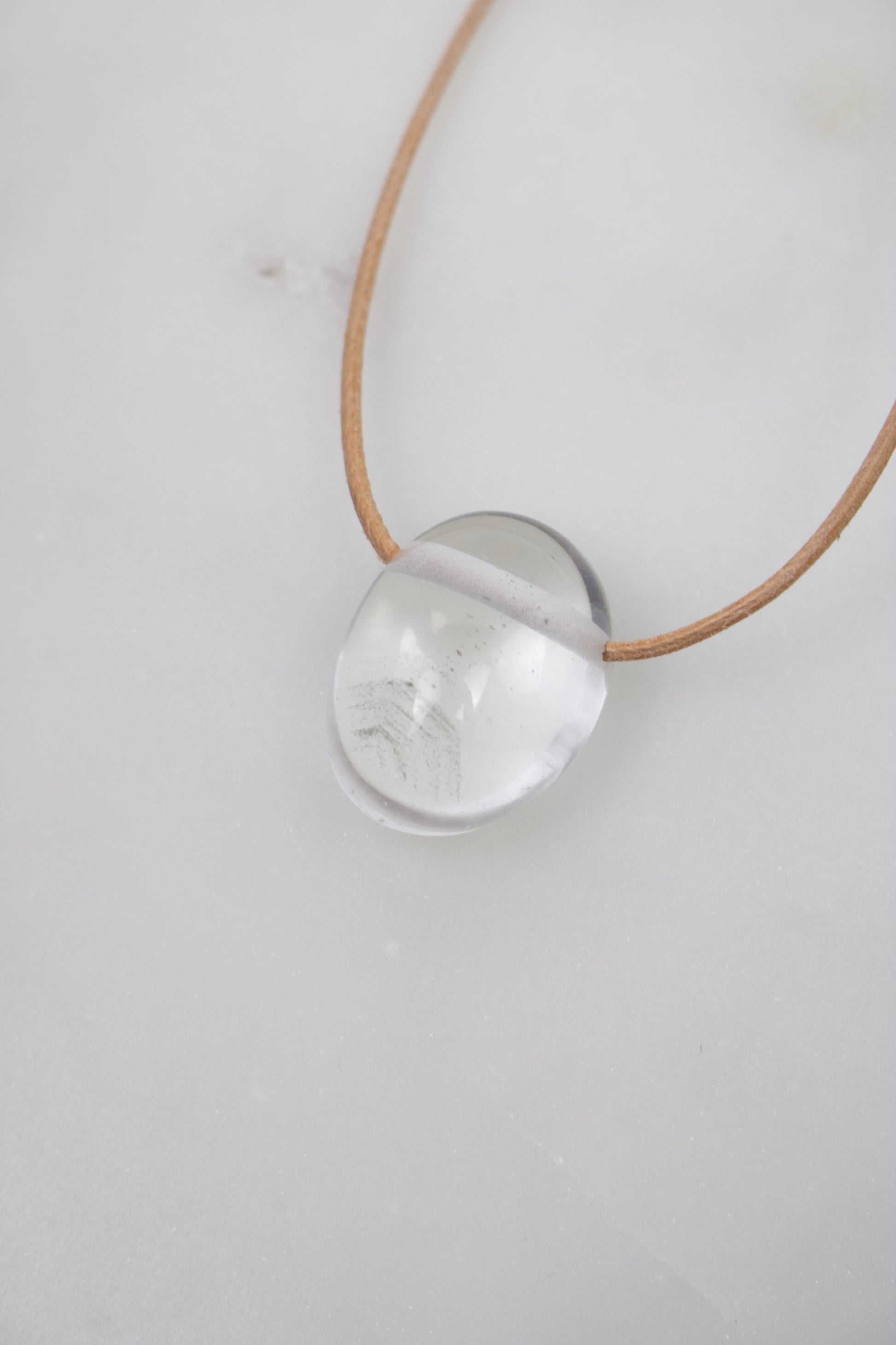 Der Anhänger wird mit einem Lederband nach Wahl kombiniert und mit einem Karabinerverschluss aus Edelstahl – wahlweise in Silber- oder Goldoptik – vollendet.