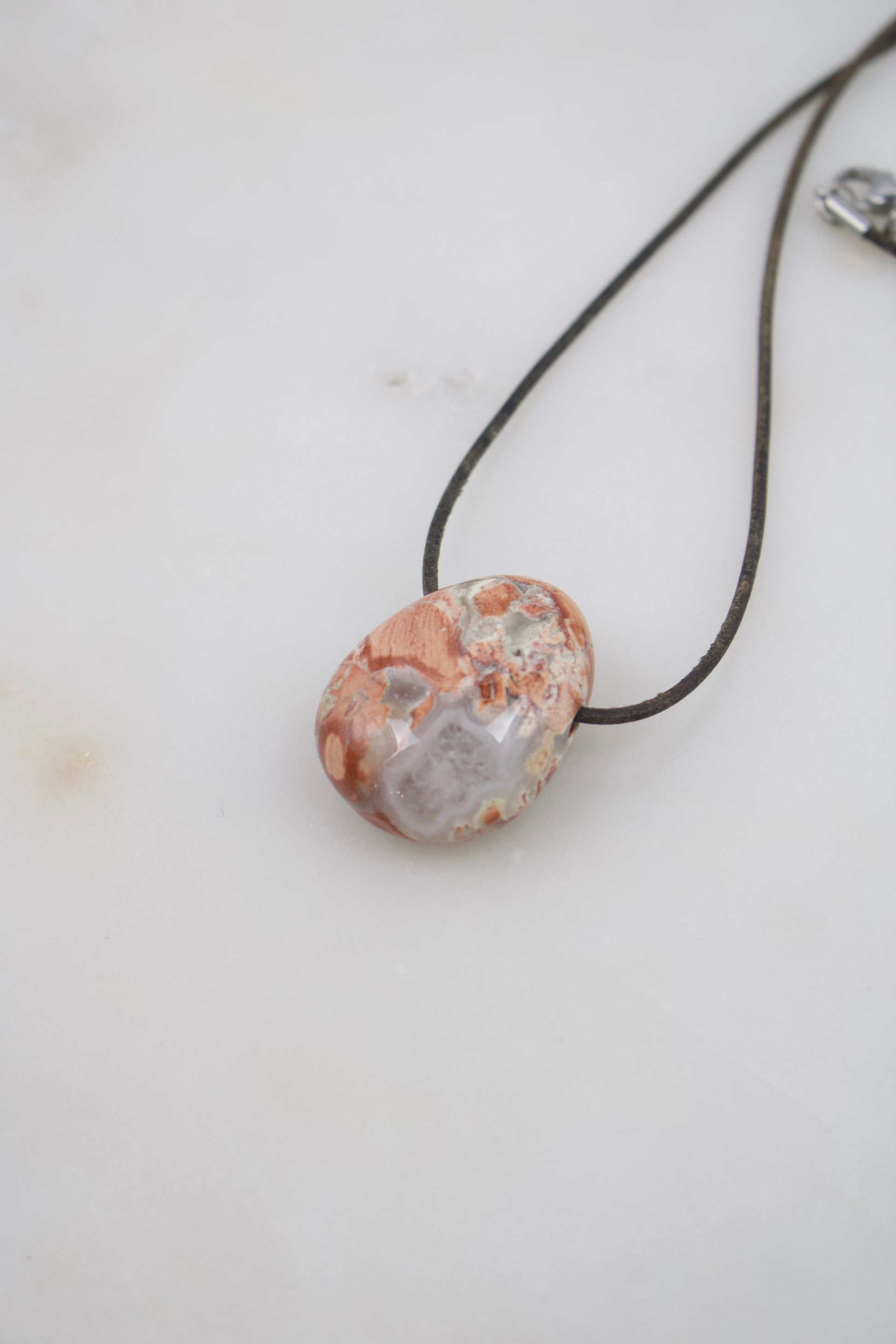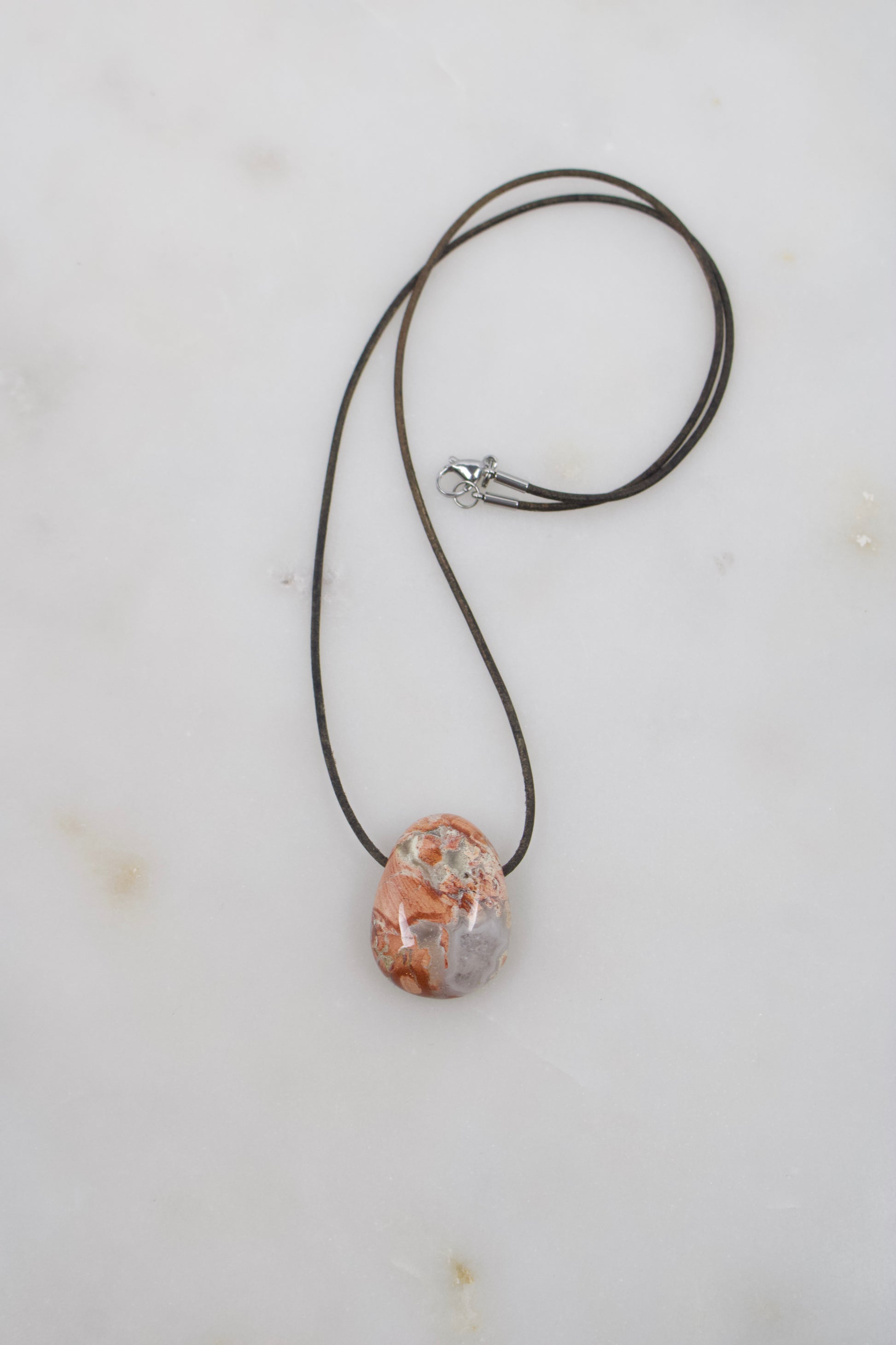 Der Anhänger wird mit einem Lederband nach Wahl getragen und durch einen Karabinerverschluss aus Edelstahl in Silber- oder Goldoptik abgerundet.