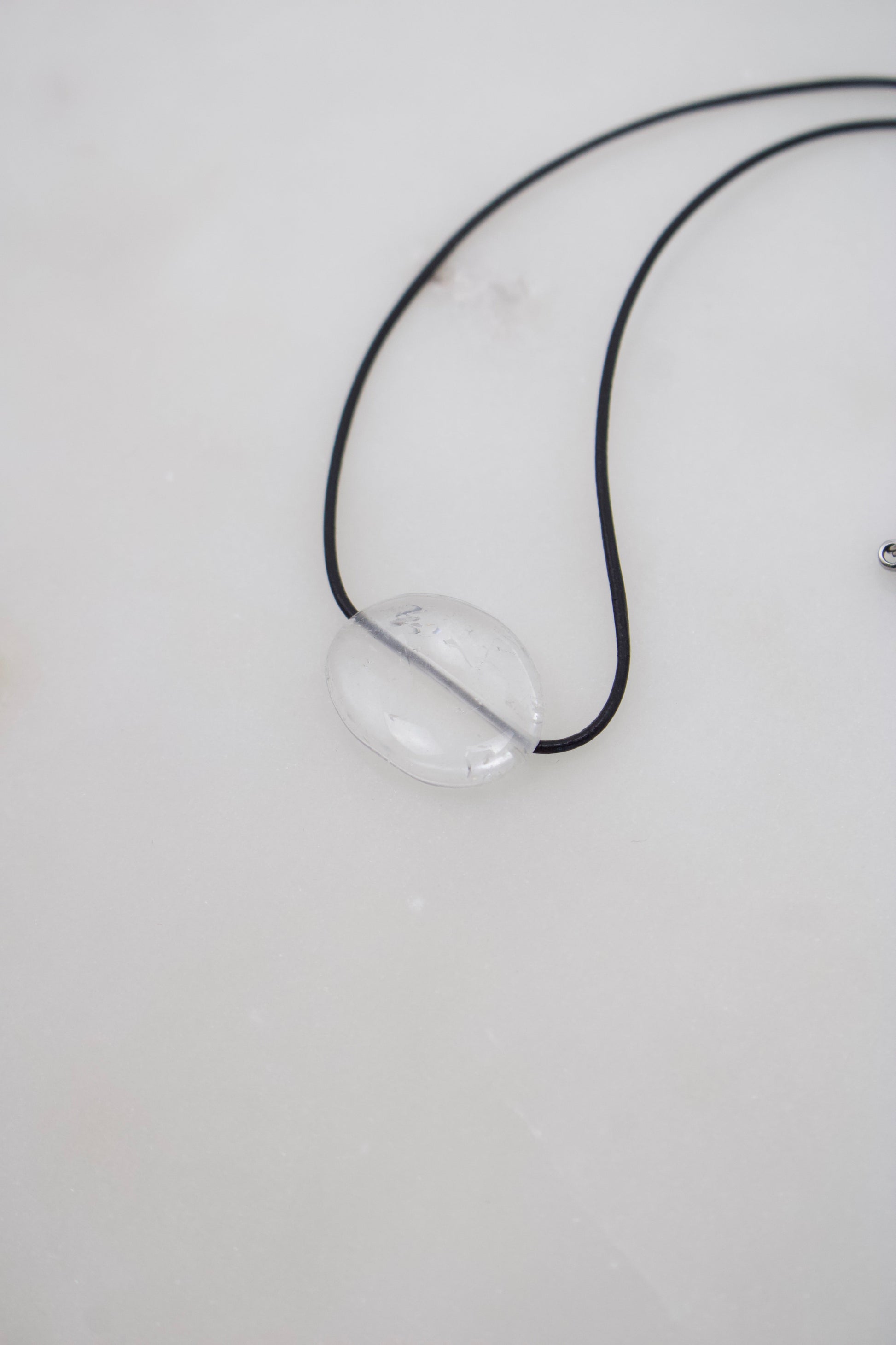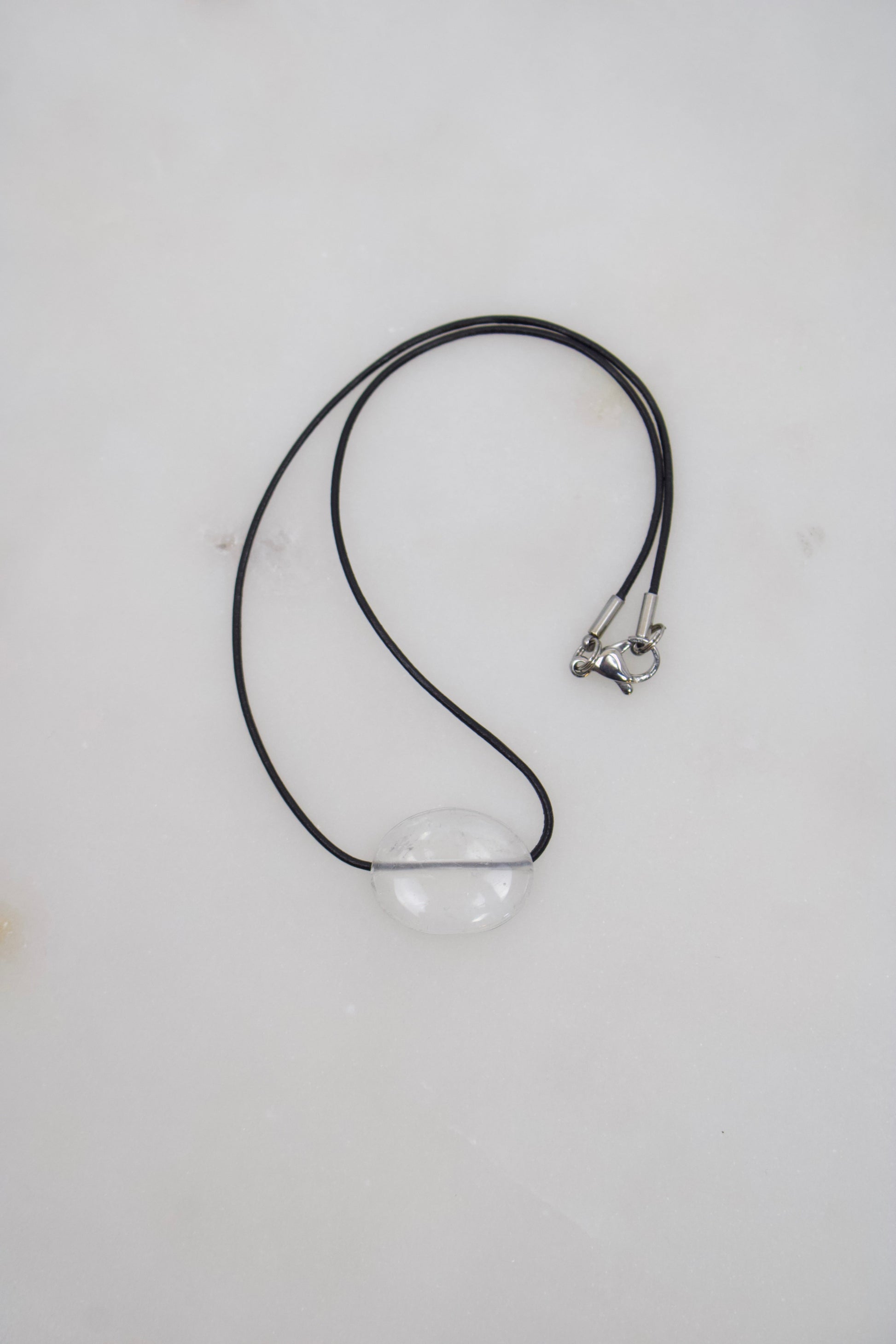 Bergkristall Nuggets in verschiedenen Größen (18-28mm) mit feinem Lederband in schwarz und Karabinerverschluss aus Edelstahl.