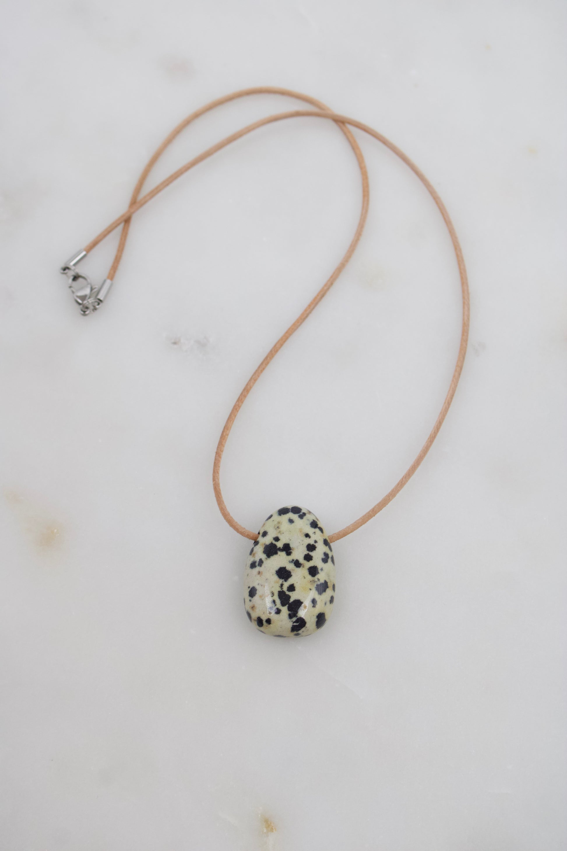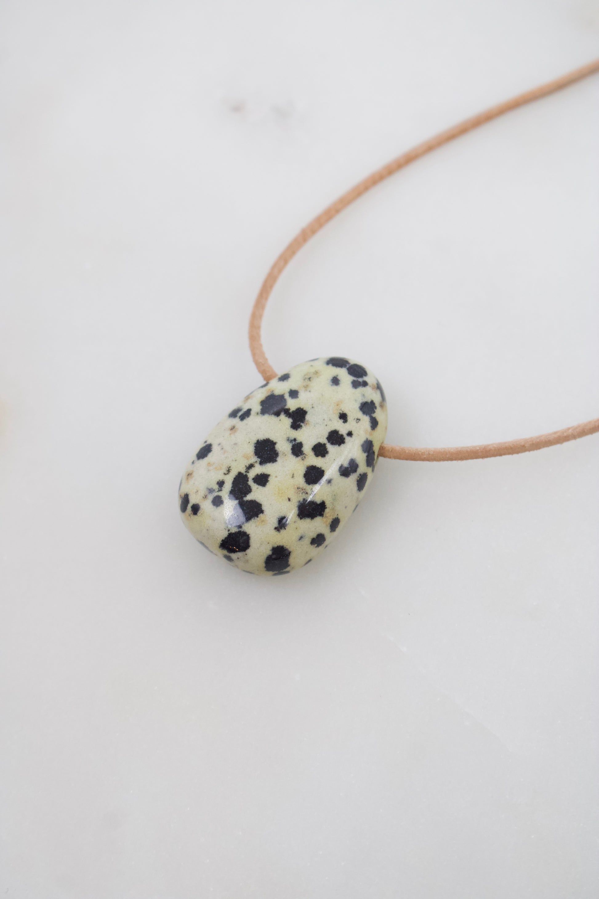 Dieser 31 mm große Dalmatinerstein-Anhänger besticht durch seinen markanten beigen bis hellbraunen Grundton mit den charakteristischen schwarzen Punkten, die an das Fell eines Dalmatiners erinnern. Jede Zeichnung ist einzigartig, wodurch jeder Anhänger zu einem unverwechselbaren Unikat wird.