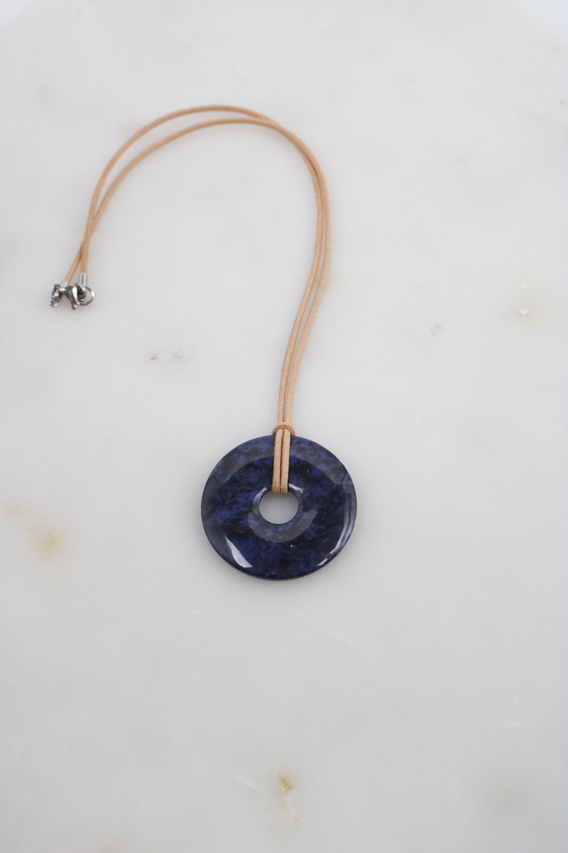 Der Donut-Anhänger wird mit einem Lederband nach Wahl getragen und durch einen Karabinerverschluss aus Edelstahl in Silber- oder Goldoptik ergänzt.