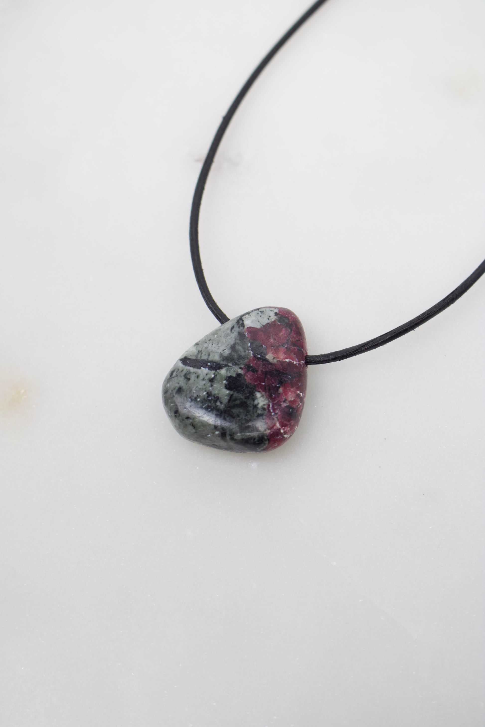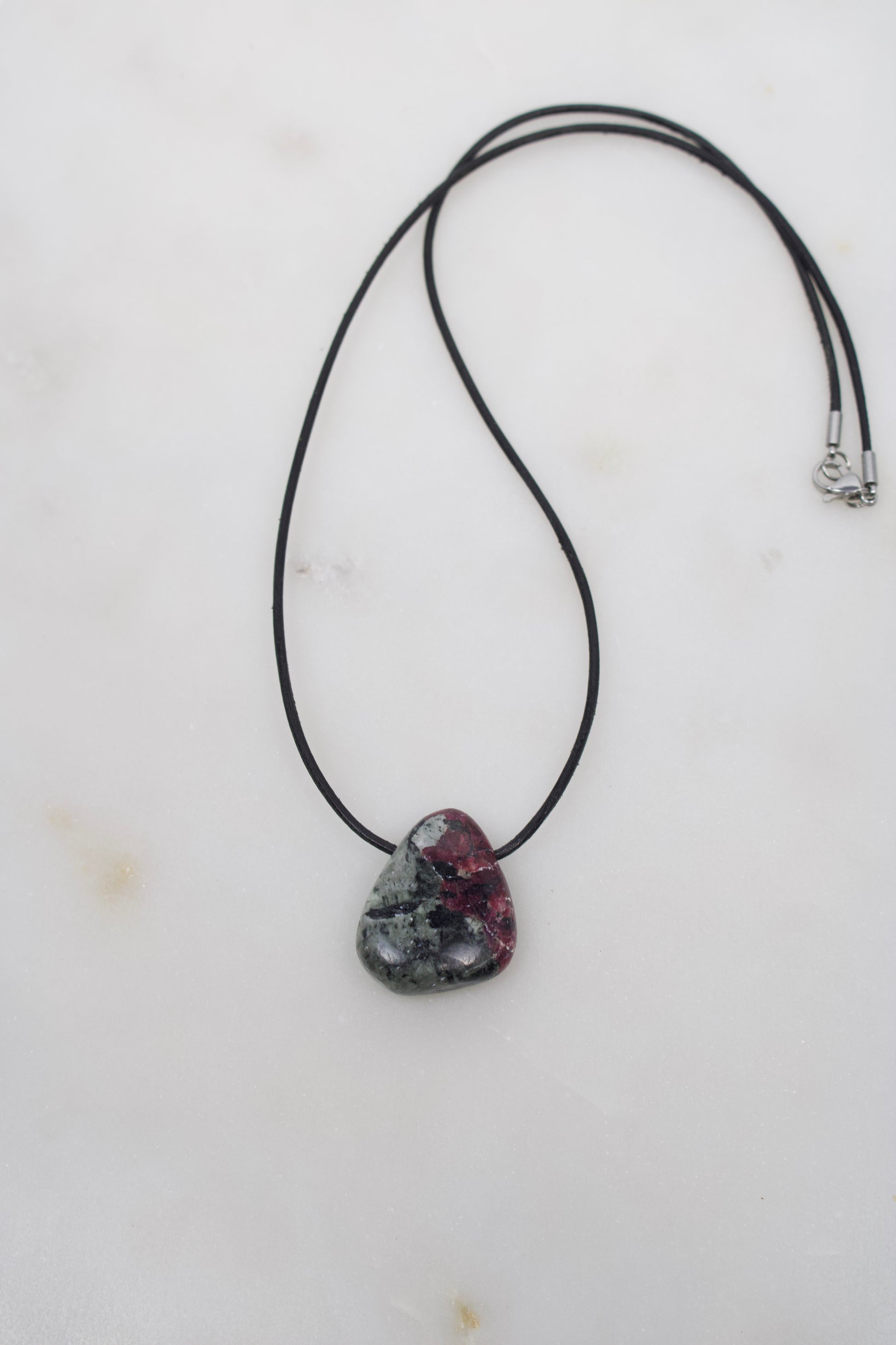 30mm Eudialyt Anhänger mit Lederband in schwarz und Verschluss aus Edelstahl.