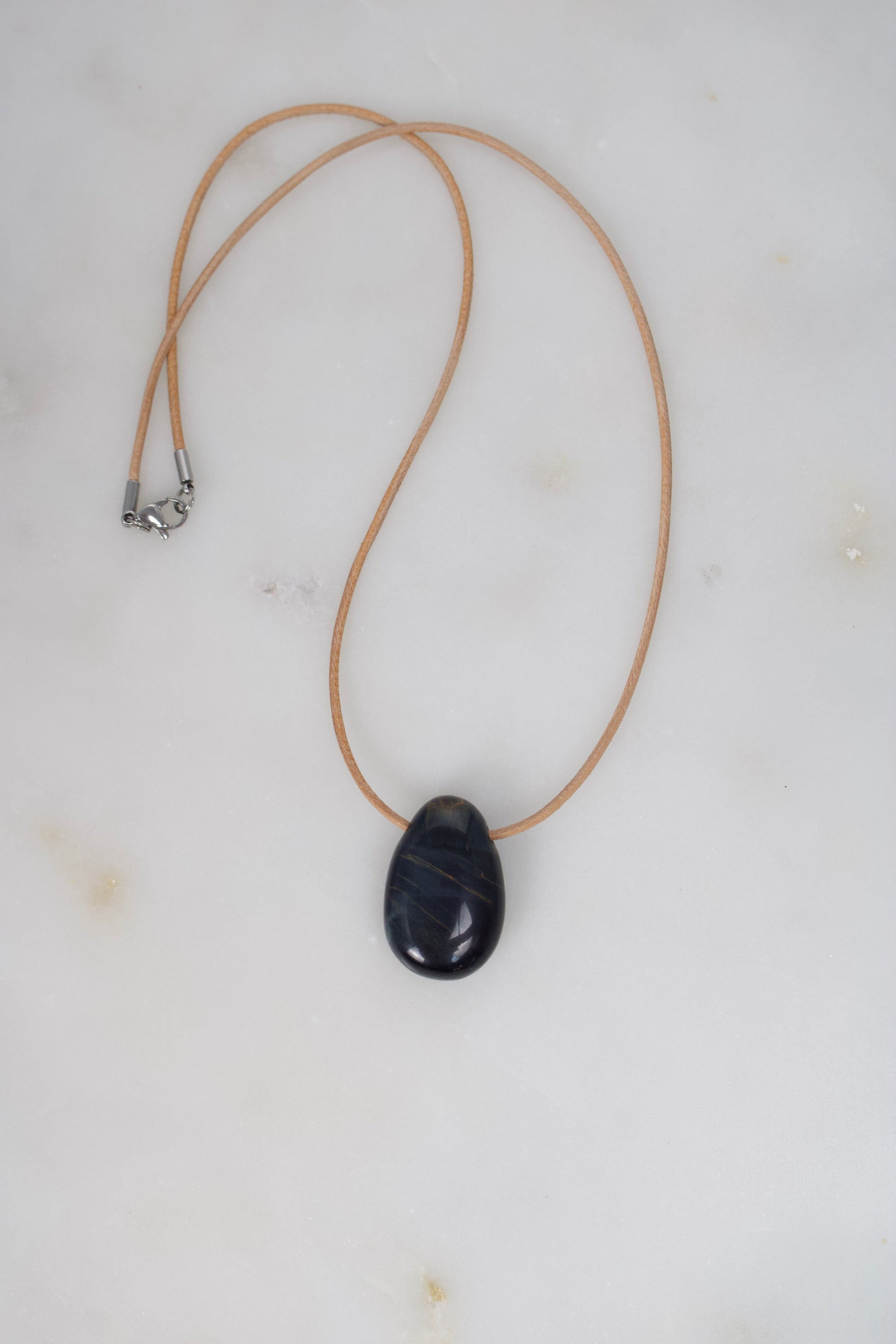 Wunderschön schimmernder 30mm Falkenauge mit Lederband in dunkelbraun und Edelstahl Karabinerverschluss.