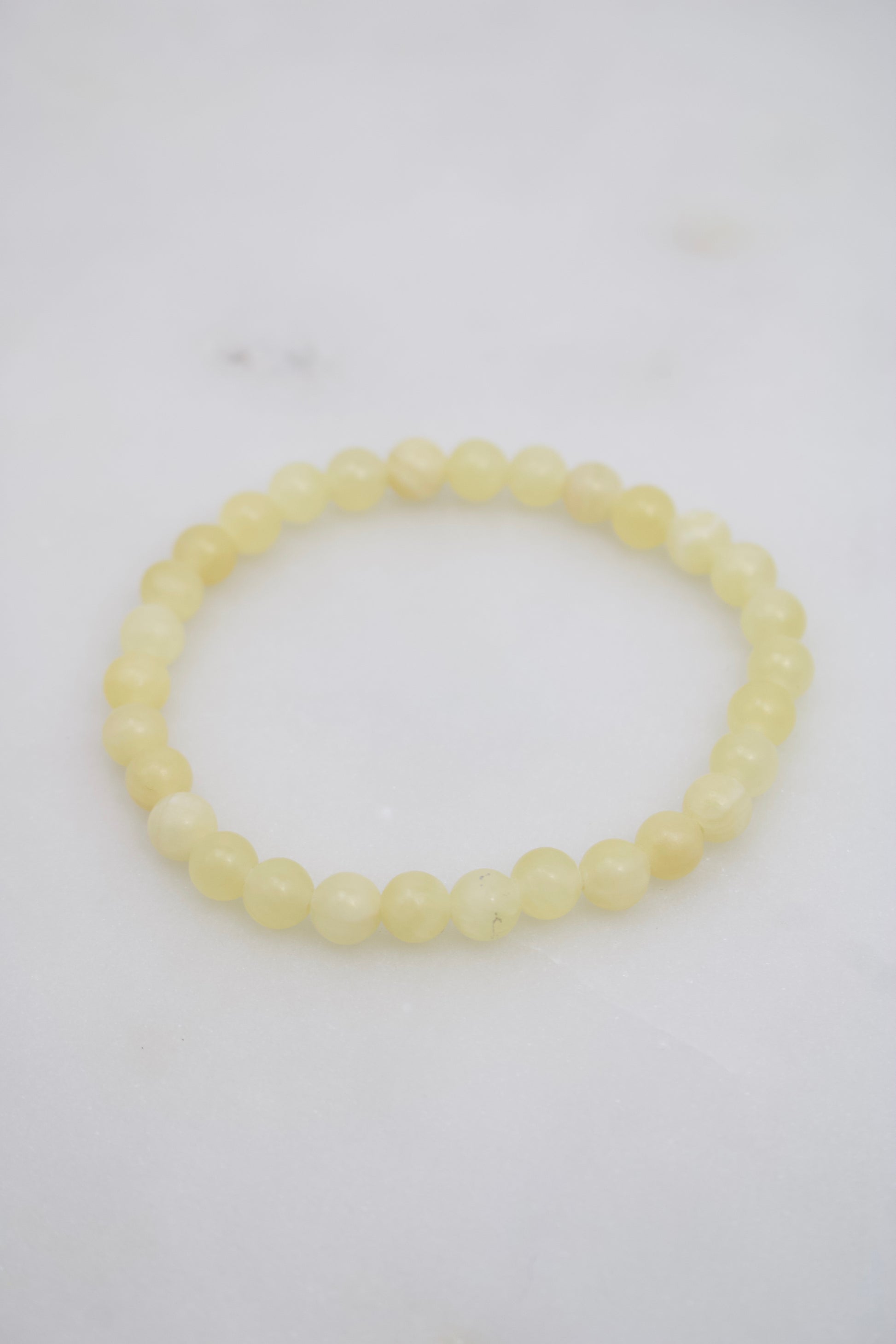 Dieses Armband aus 6 mm runden Perlen gelben Calcit bringt mit seinem warmen, honigfarbenen Ton Licht in jeden Moment. Der feine Schimmer und die weiche Ausstrahlung der Steine verleihen dem Schmuckstück eine positive, sonnige Energie – zurückhaltend und gleichzeitig lebendig.