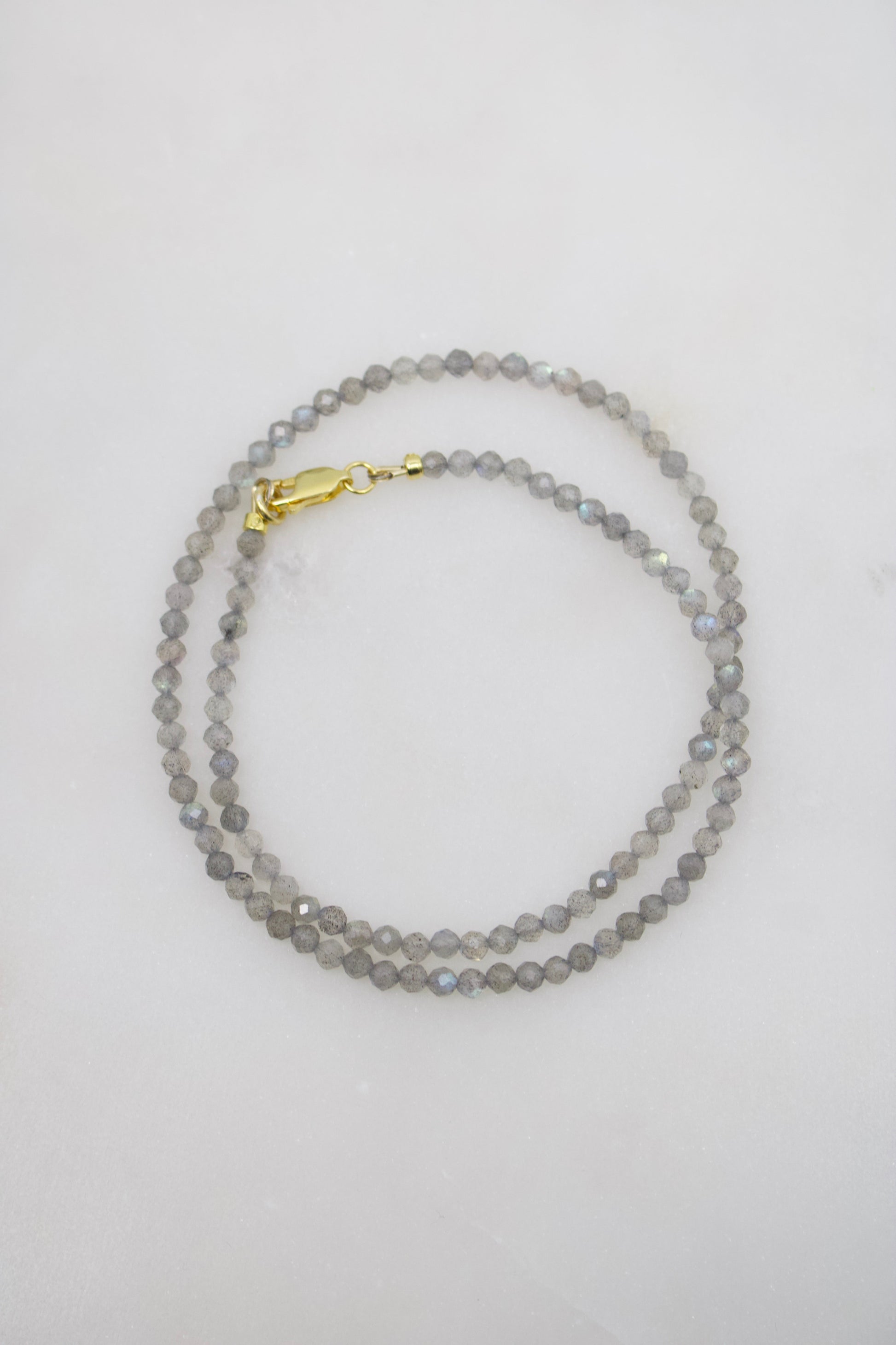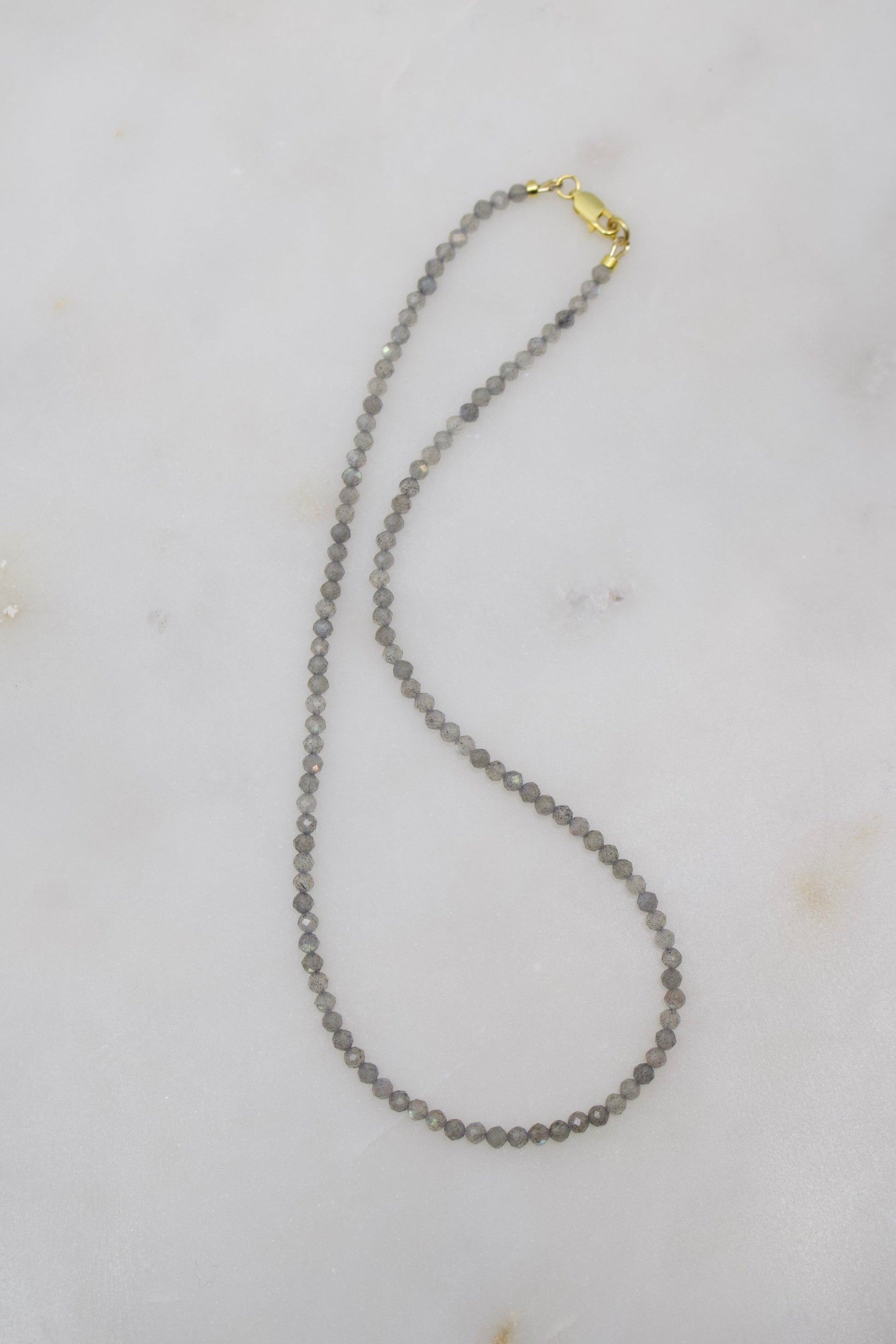 Diese 41 cm lange Perlenkette aus Labradorit besticht durch ihre fein facettierten AAA-Qualitätsperlen, die ein dezentes Grau zeigen und bei Lichteinfall ihr charakteristisches, schimmerndes Farbspiel entfalten. Die harmonische Farbgebung macht die Kette zu einem eleganten und lebendigen Schmuckstück.