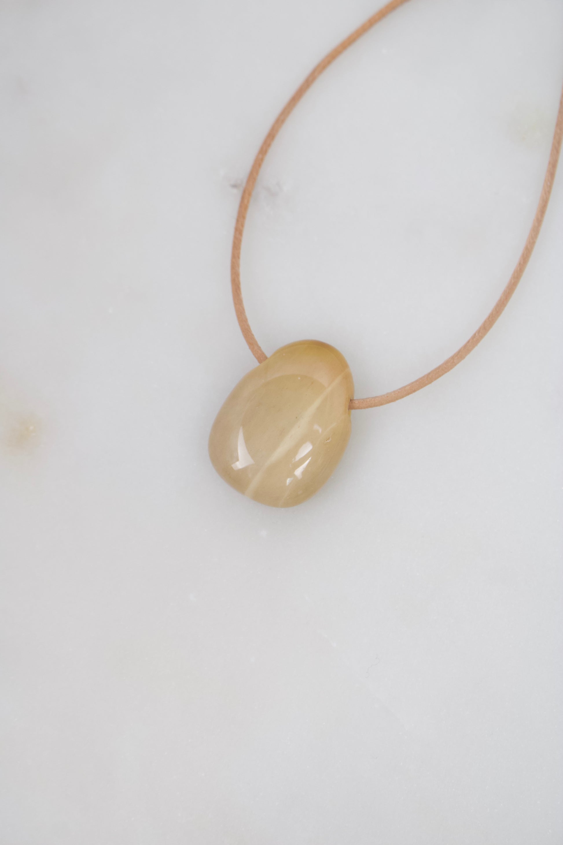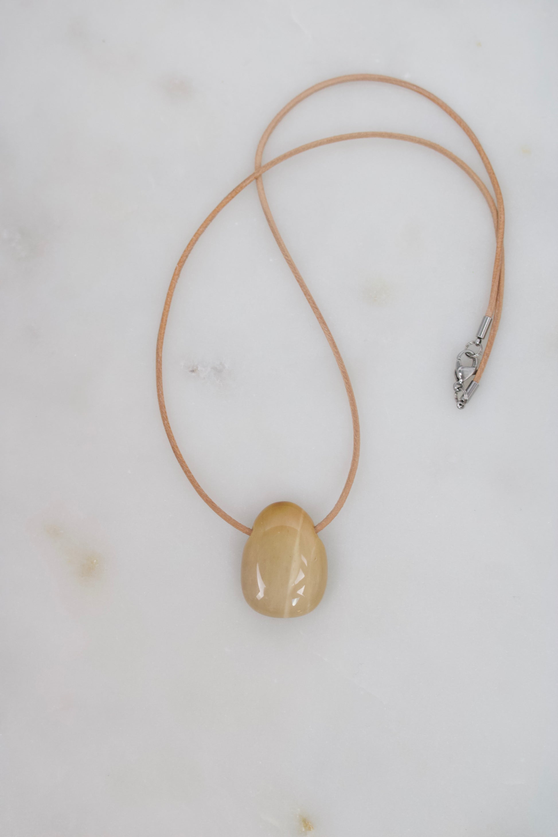 Der Anhänger wird mit einem Lederband nach Wahl getragen und durch einen Karabinerverschluss aus Edelstahl in Silber- oder Goldoptik abgerundet.