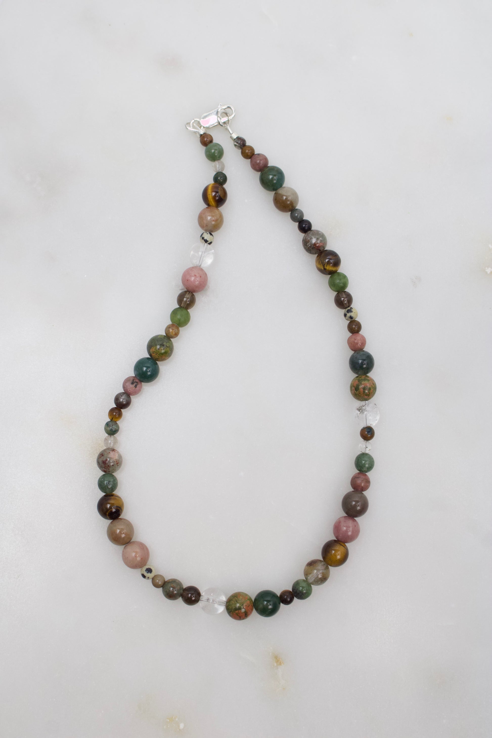 Die Kette besteht aus einer harmonischen Kombination aus Tigerauge, Unakit, Jade, Rhodonit, Lodolith, Moosachat, Rauchquarz, Polychrom Jaspis, Bergkristall und Dalmatiner Stein. Jeder dieser Edelsteine wurde mit Bedacht ausgewählt, um positive Energie zu fördern, Klarheit zu schaffen und das emotionale Gleichgewicht zu stärken.