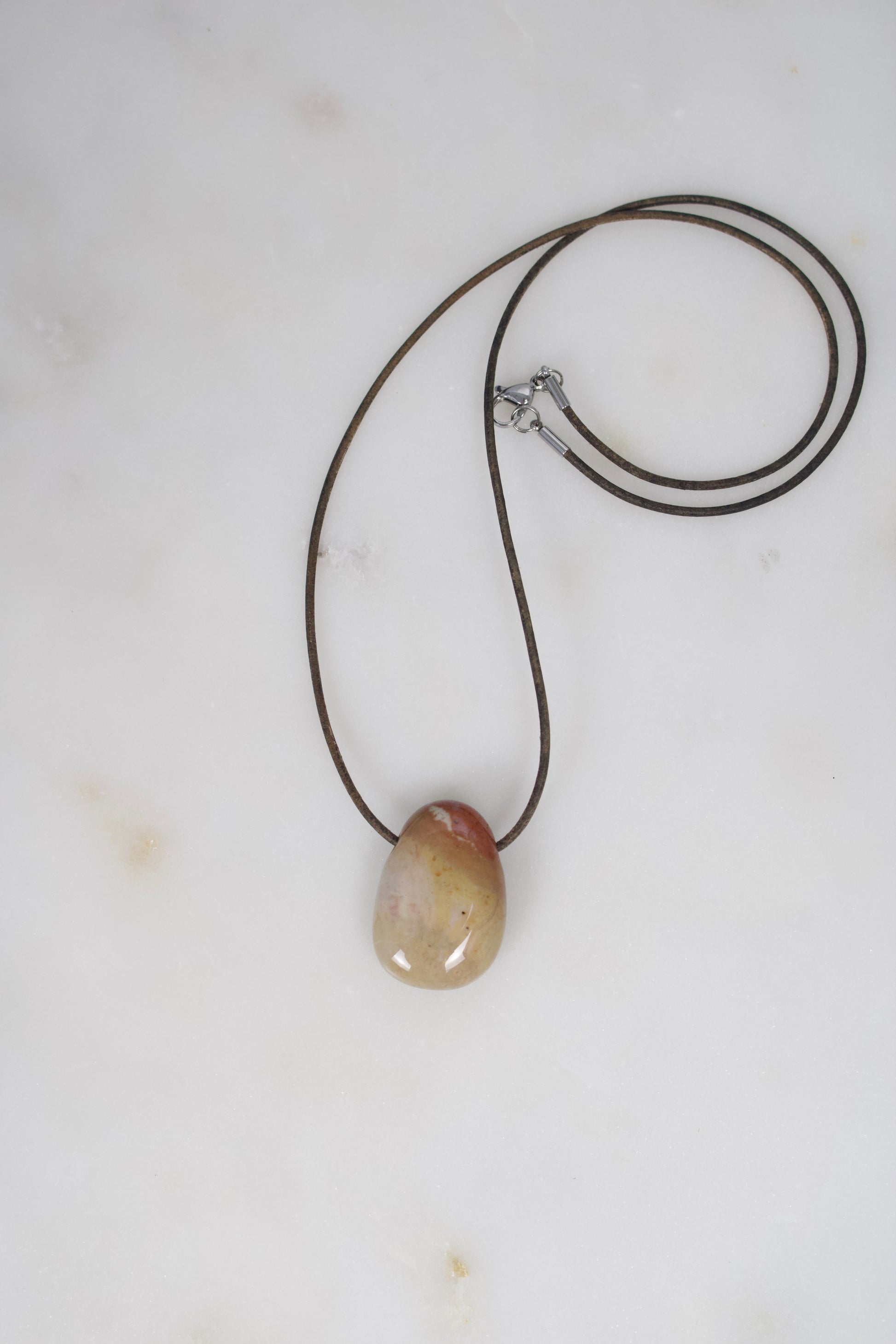 Hellbrauner Polychrom Jaspis – 32 mm Anhänger mit Lederband nach Wahl und Edelstahl-Karabinerverschluss