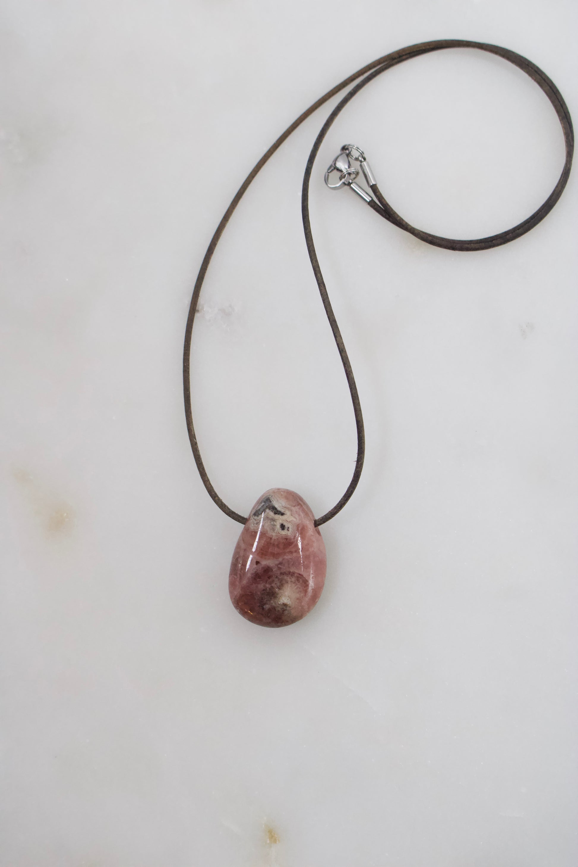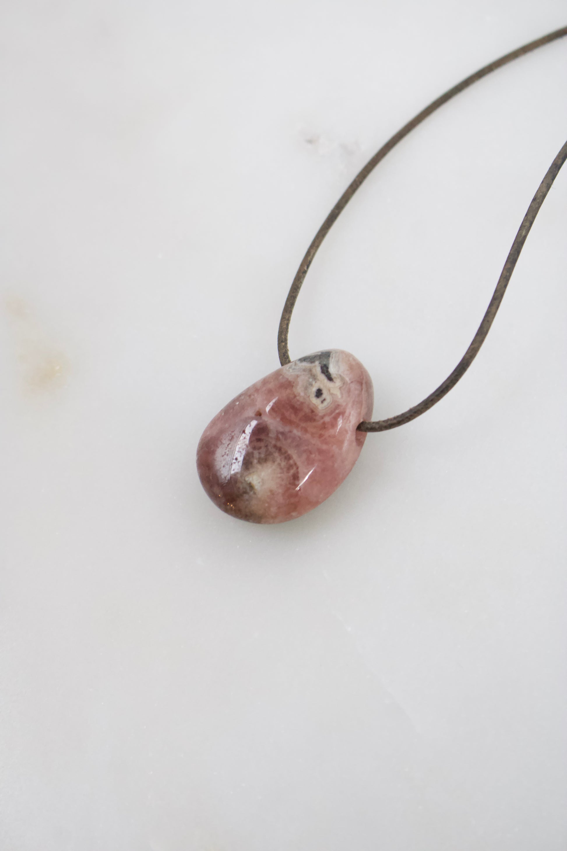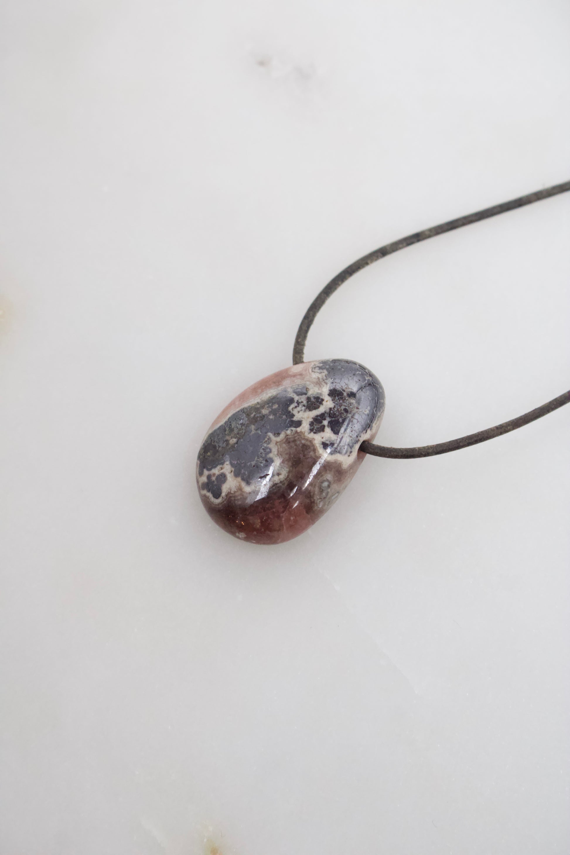 Dieser 31,9 mm große Rhodochrosit-Anhänger zeigt einen warmen, rötlichen Farbton, durchzogen von dezenten metallischen Einschlüssen, wie z. B. Hämatit. Die Einschlüsse bringen einen subtilen Glanz in den Stein und machen jedes Stück zu einem kleinen, natürlichen Unikat voller Ausdruckskraft.