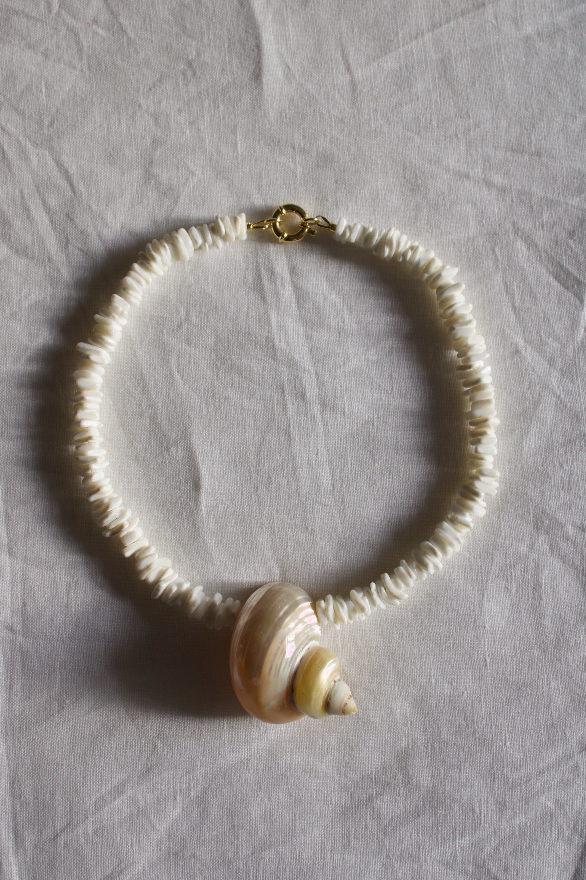 Handgefertigte Kette aus weißen Muschelsplittern mit einem großen schneckenförmigen Muschelanhänger (ca. 45 mm) in Perlmuttfarben.