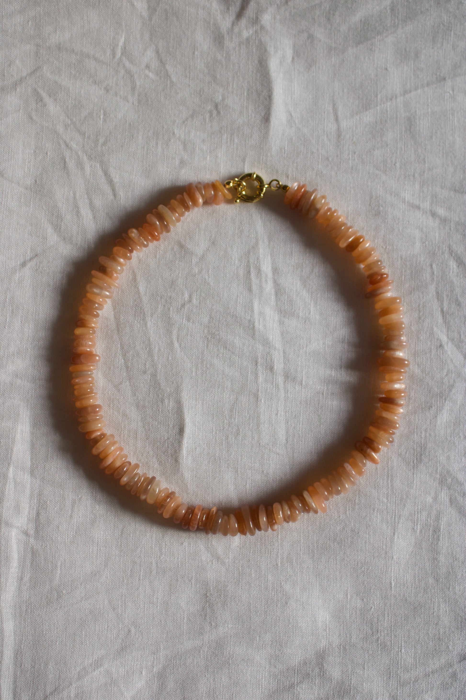 Diese Kette besteht aus pfirsichfarbenen Mondstein-Freeform-Rondellen, die mit jedem Lichtspiel eine sanfte Wärme ausstrahlen.