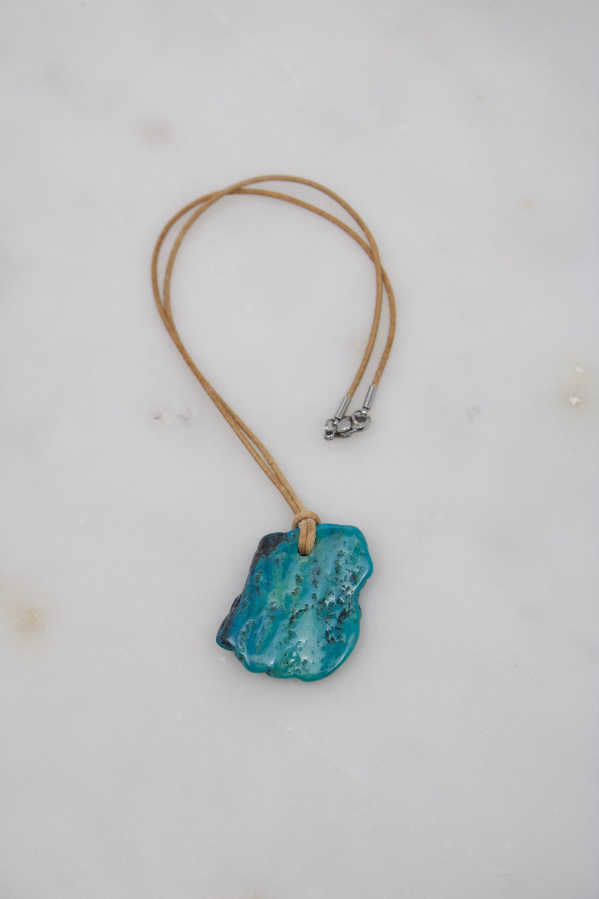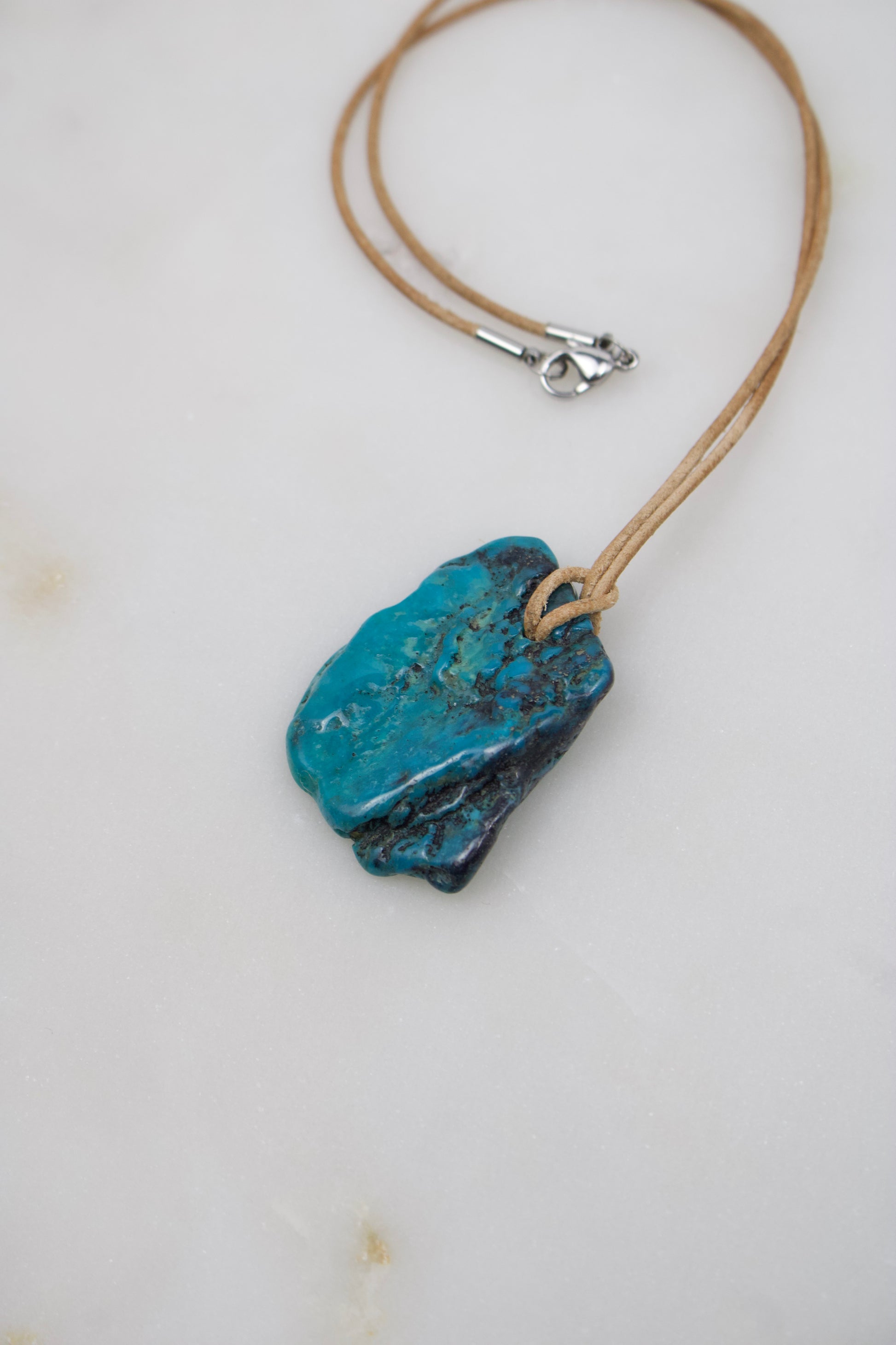 Dieser Türkis-Anhänger in Rohform (43,5 mm) besticht durch sein intensives, leuchtendes Blau und die natürliche Maserung. Die ungeschliffene Oberfläche bewahrt den ursprünglichen Charakter des Steins – so, wie ihn die Natur geschaffen hat.