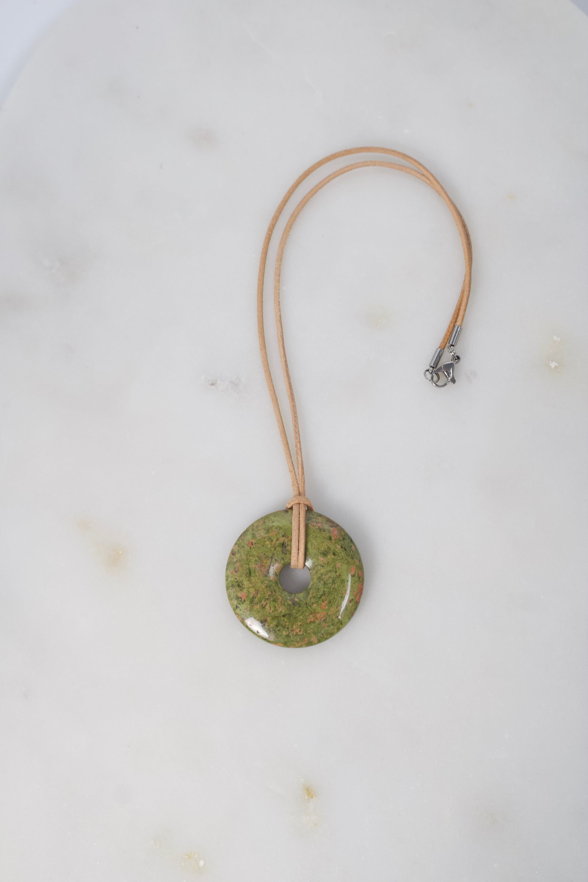 Dieser 40 mm große Unakit-Donut fällt durch seine harmonische Mischung aus sanftem Grün und warmen Rosatönen auf, die in der glatten Oberfläche wunderschön ineinander verlaufen. Die klassische Donutform steht für Schutz, Harmonie und einen ausgeglichenen Energiefluss, sodass jedes Stück sowohl optisch als auch energetisch eine besondere Wirkung trägt.