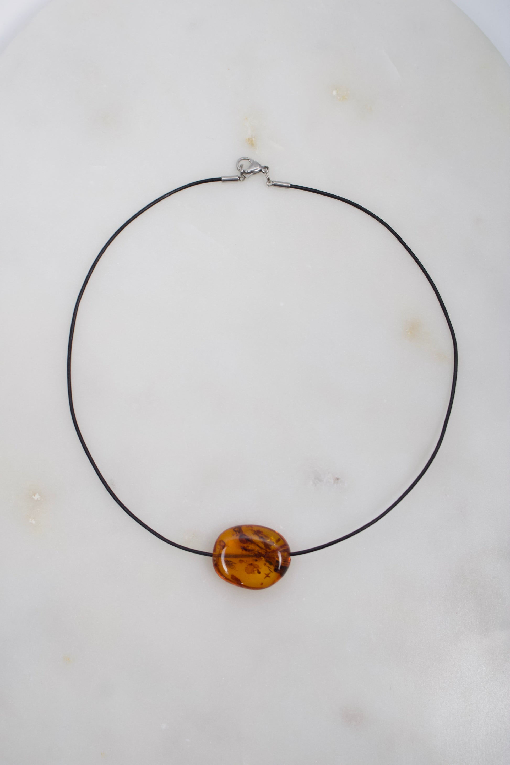 Der Anhänger wird an einem feinen schwarzen Lederband getragen, das den warmen Ton des Bernsteins besonders schön hervorhebt und dem Schmuckstück eine natürliche, zeitlose Ausstrahlung verleiht.