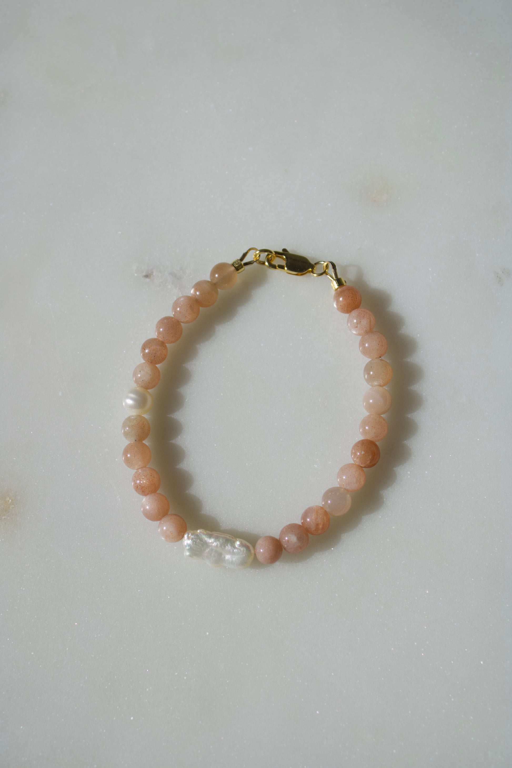 Das Earth & Sea Bracelet ist die zarte Ergänzung zu unserer Kette und vereint die natürliche Schönheit von Mondsteinperlen mit zwei besonderen Süßwasserperlen – einer länglichen Freiform-Perle und einer klassischen runden Perle. Es ist in pfirsichfarbenem oder schokobraunem Mondstein erhältlich, wobei jeder Stein für Sanftmut, innere Ruhe und emotionale Wärme steht.