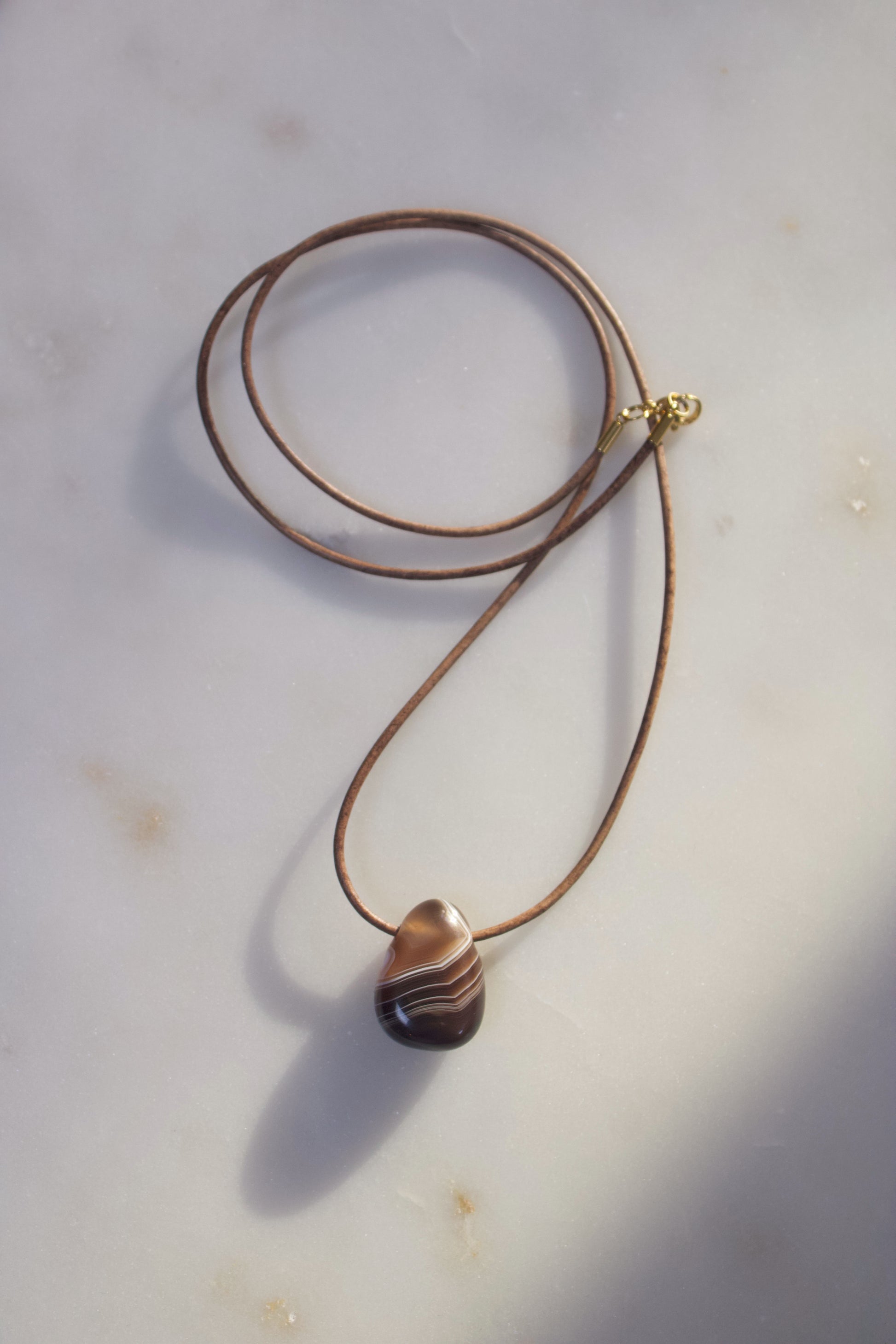 Der Anhänger wird an einem edlen, grau-braunen Lederband getragen, das die erdige Farbwelt des Steins harmonisch aufgreift und unterstreicht. Ein hochwertiger Karabinerverschluss aus Edelstahl in goldfarbener Ausführung rundet das Design stilvoll ab und sorgt für sicheren Halt.
