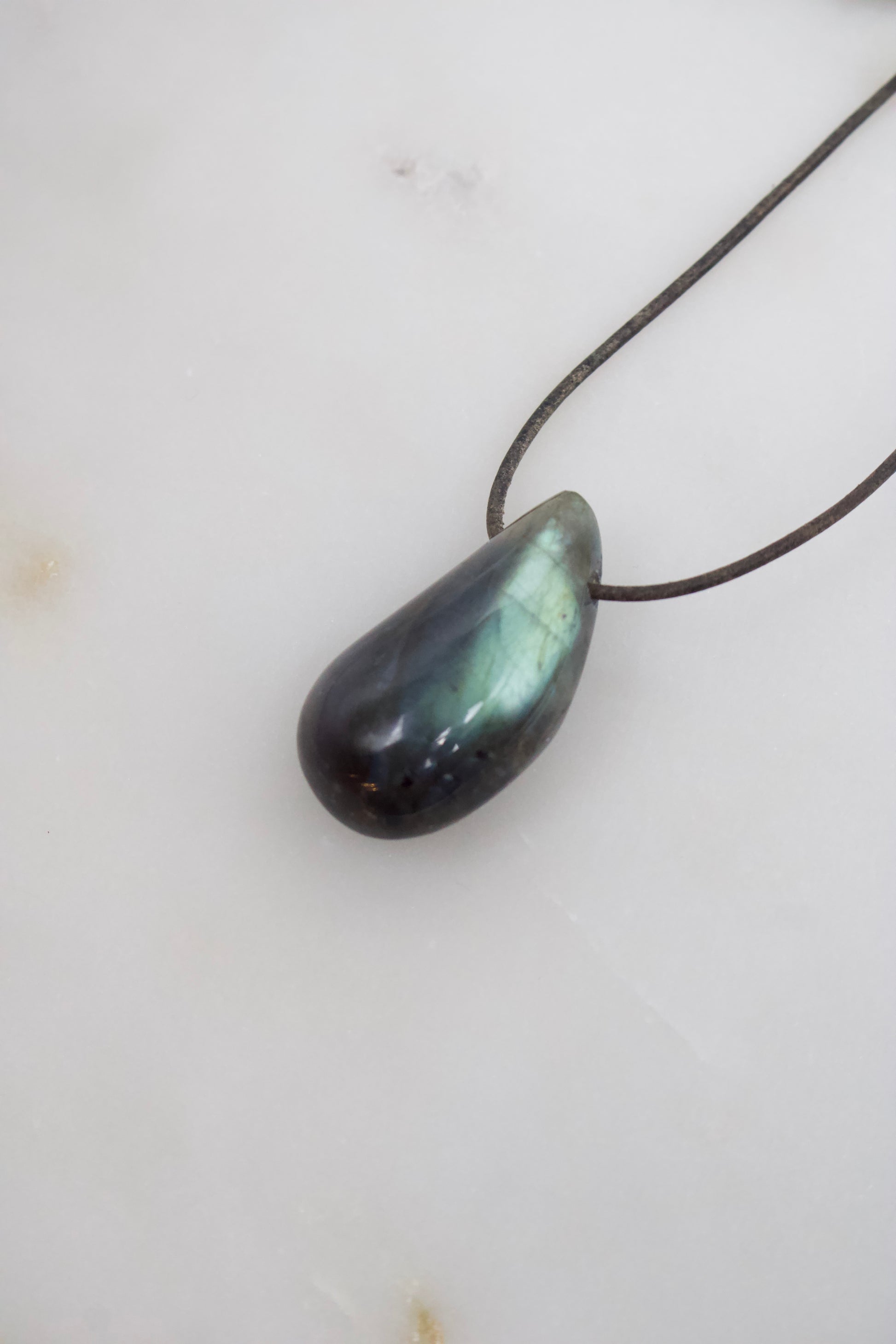 Tropfenförmiger Labradorit Anhänger – 41 mm · mit Lederband nach Wahl
