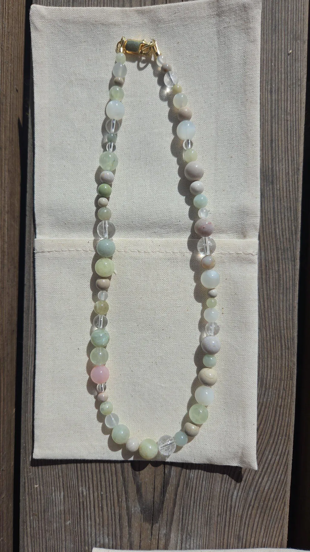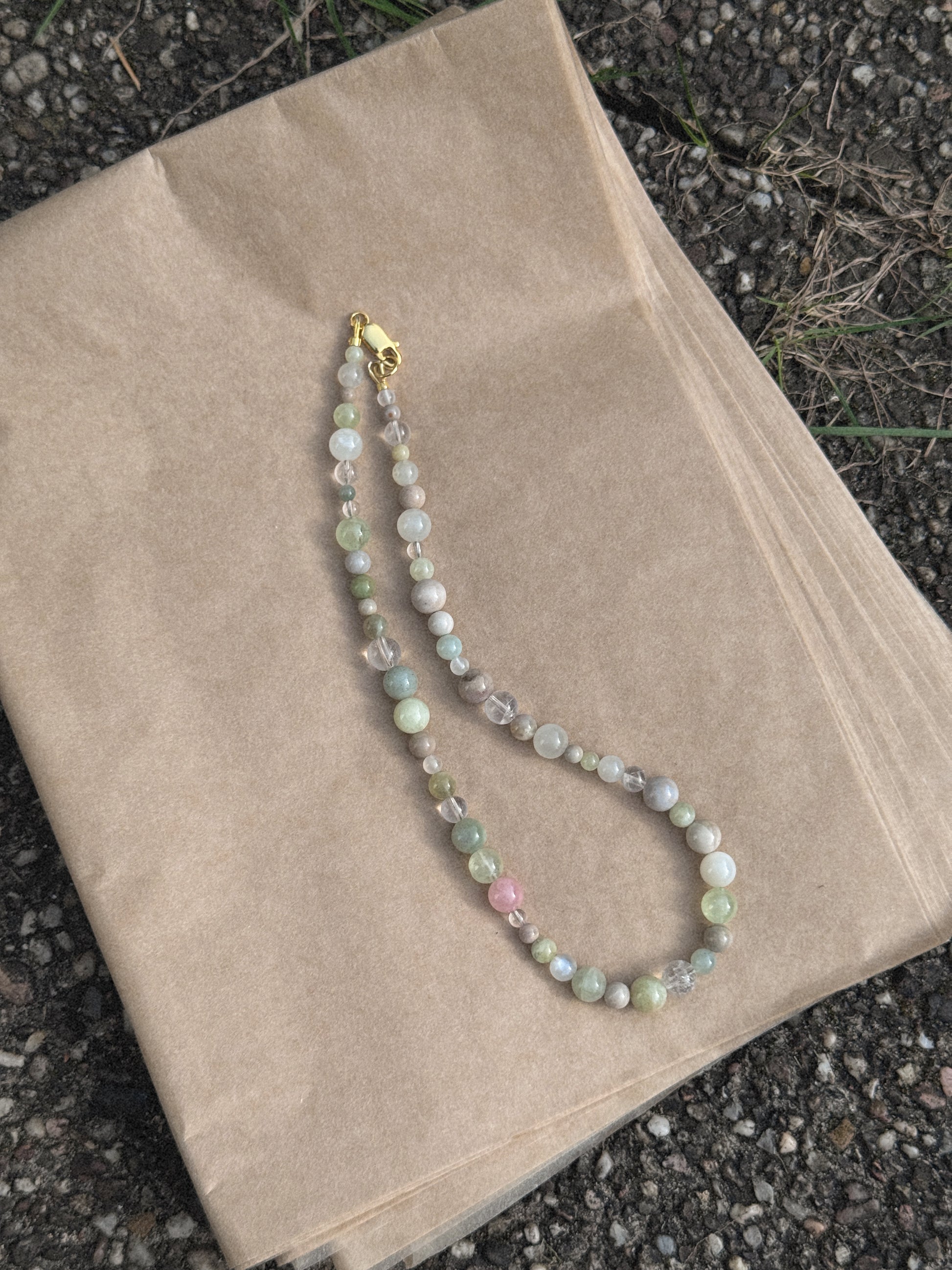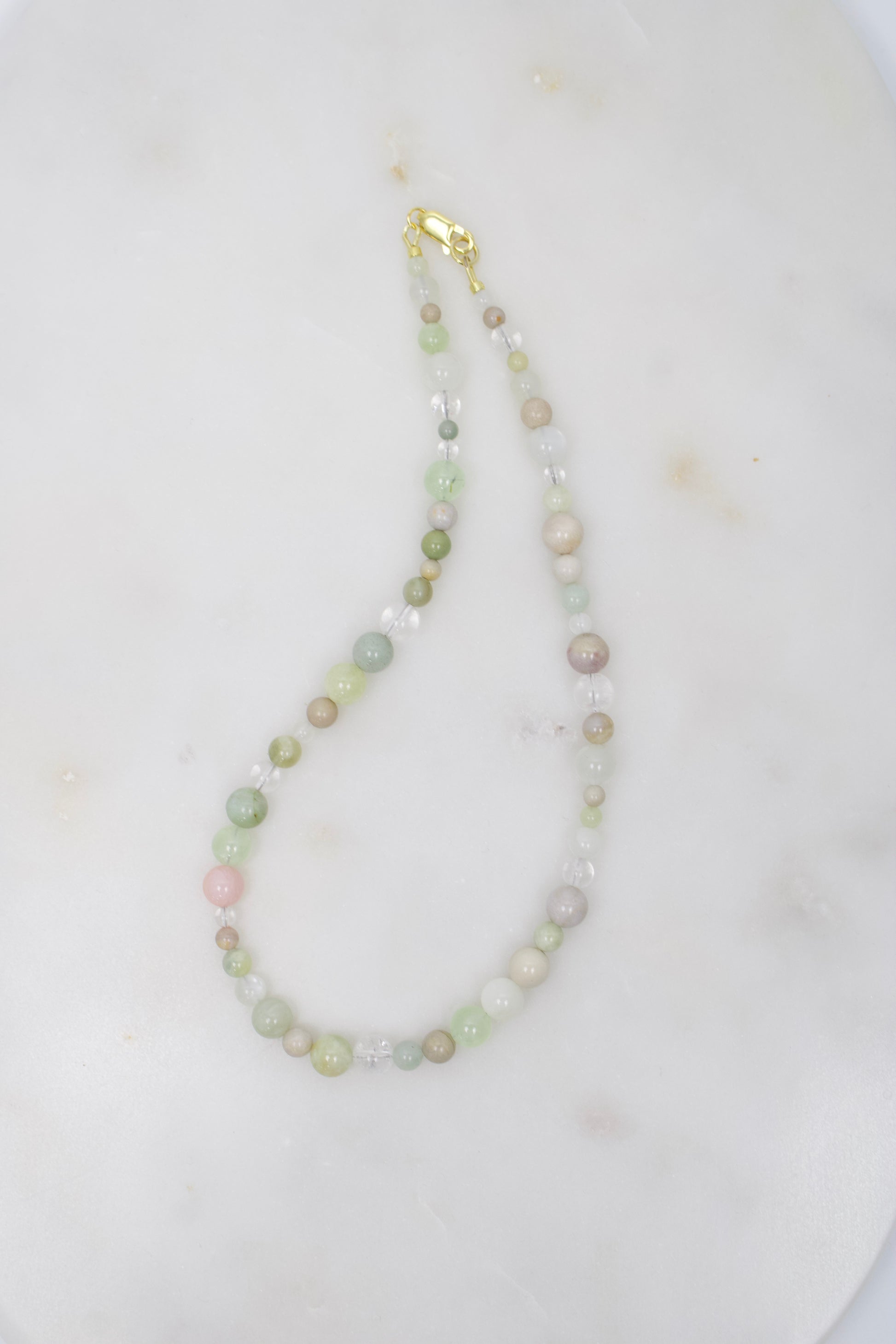 Garnierit, Heliodor, Bergkristall, cremeweißer Mondstein, Prehnit, Alashan-Achat, versteinerte Koralle und cremefarbener Ozean-Jaspis fügen sich zu einer fein abgestimmten Komposition natürlicher Edelsteine. Eine einzelne rosafarbene Achatperle setzt einen zarten Akzent und symbolisiert die erste Blüte des Frühlings – das Aufbrechen neuer Energie und das sanfte Aufblühen der Natur. Der hochwertige Verschluss ist wahlweise aus Sterling Silber oder aus 14K vergoldetem Silber gefertigt und fügt sich harmonisch in das ruhige Gesamtbild ein.