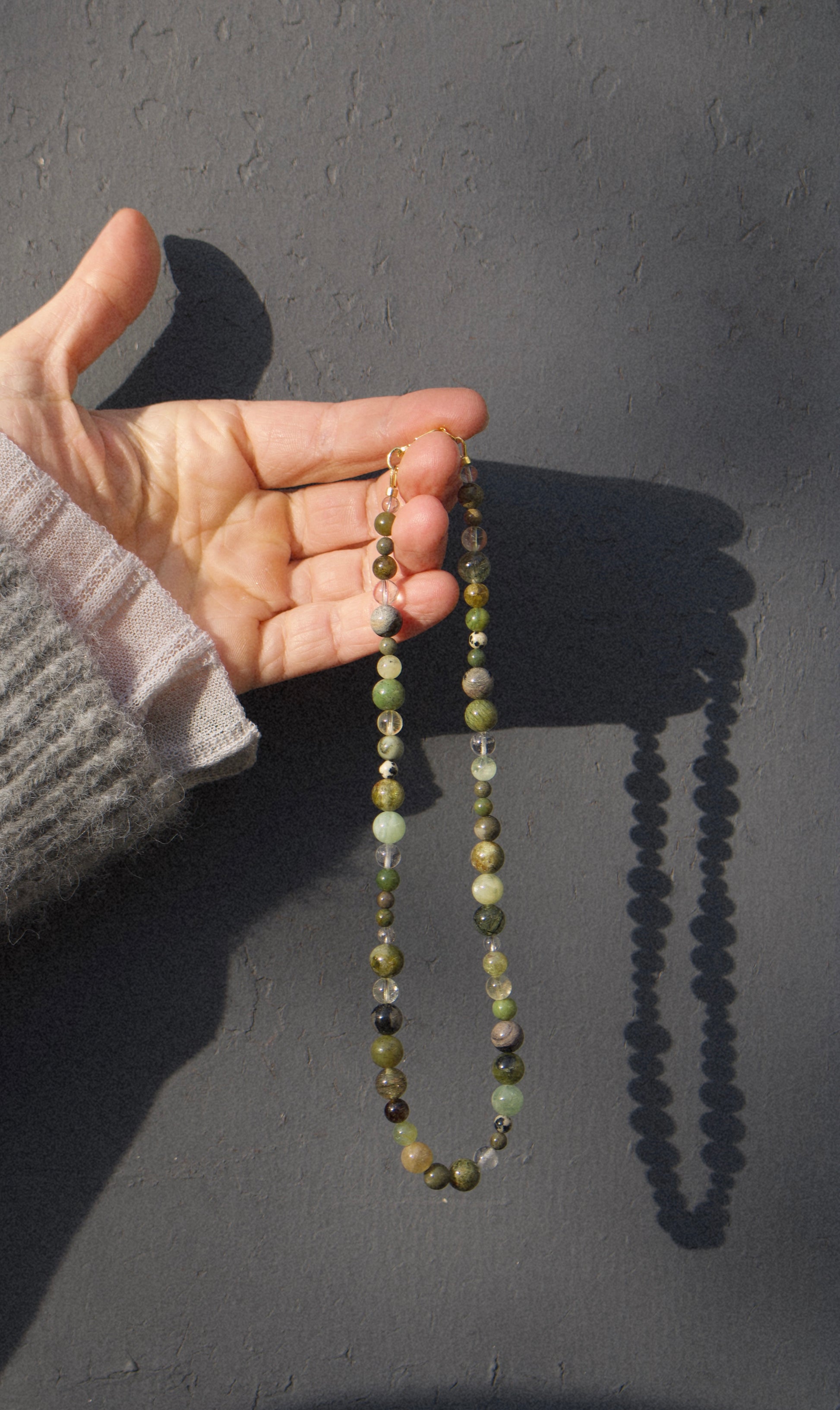 „Erva“ trägt die stille Magie des winterlichen Grüns in sich – jene besondere Atmosphäre, wenn kaltes Licht auf tiefgrüne Erde trifft und die Natur in ihrer ruhigen, klaren Kraft ruht. Diese Kette vereint ausgewählte Edelsteine in sanften Grün-, Gold- und Erdtönen zu einer harmonischen Komposition, die Erdung, Licht und leise Transformation in sich trägt.