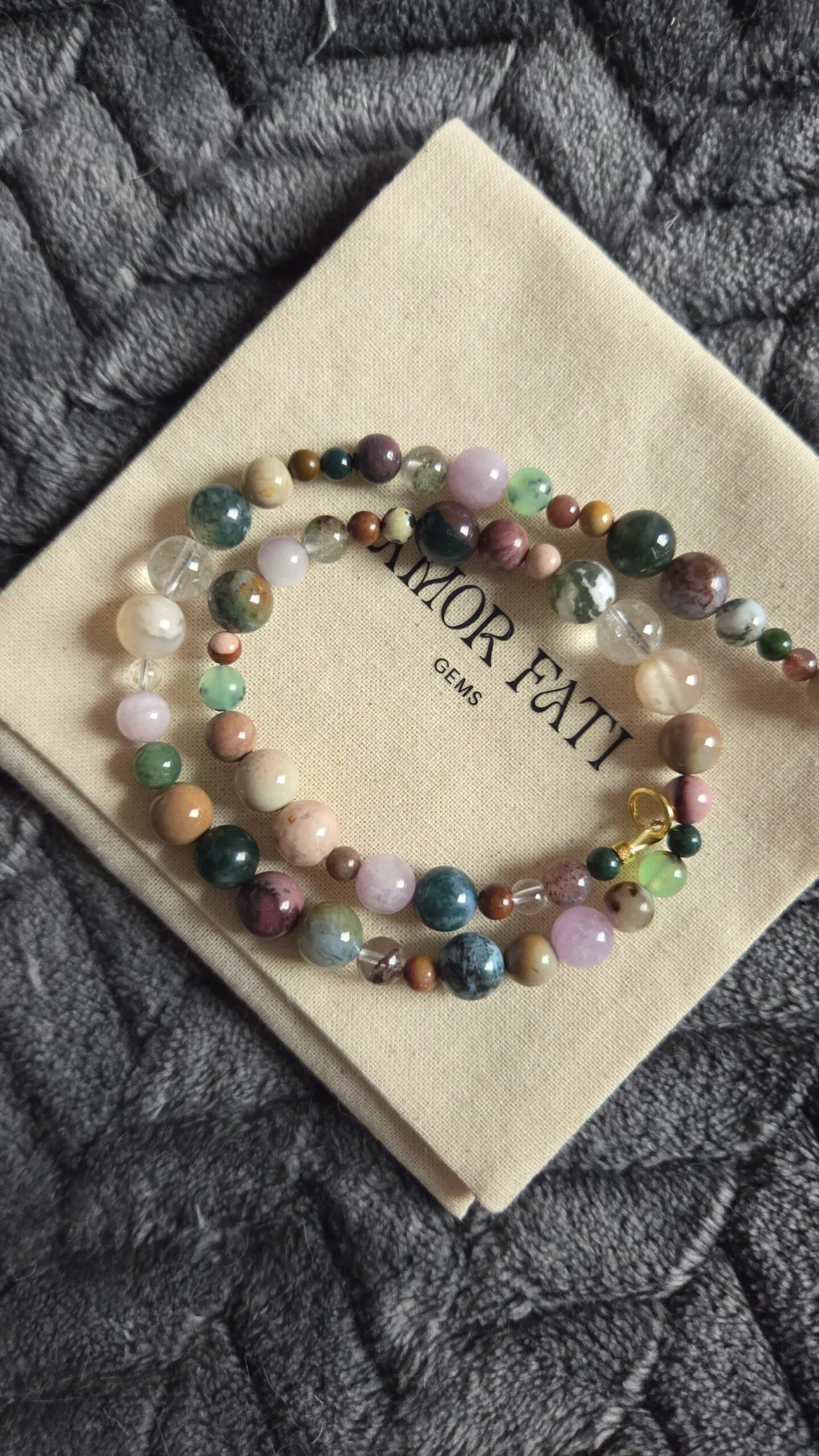 Die Kette besteht aus einer Auswahl besonderer Edelsteine, darunter Kunzit, Kirschblüten-Chalcedon, Baumachat, Indischer Achat, Mookait, Chrysopras, Moosachat, Bergkristall, rosa Turmalin, Ozean Jaspis und Polychrom Jaspis. Jeder Stein wurde bewusst gewählt, um Ruhe, Klarheit, Kreativität und Wohlbefinden zu fördern.