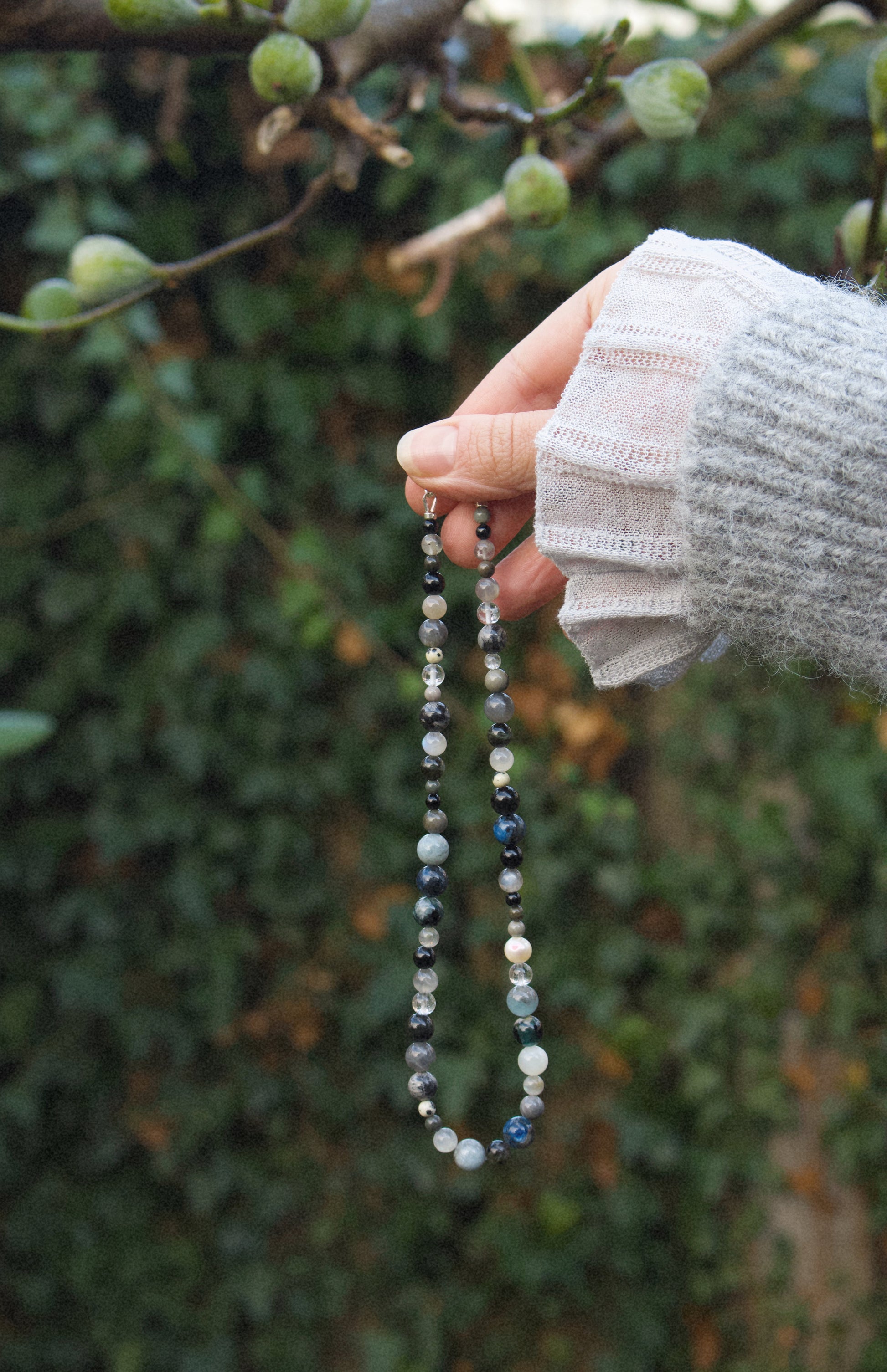 „Lua“ – der Mond – ist ein Amulett der Nacht. Diese Kette trägt die sanfte Magie des Winters in sich: klare Luft, stille Wälder, silbriges Licht auf dunklem Grund. Jeder Stein wurde so gewählt, dass er die tiefe, intuitive Kraft des Mondes widerspiegelt und die zarten Übergänge zwischen Schatten und Leuchten spürbar macht.