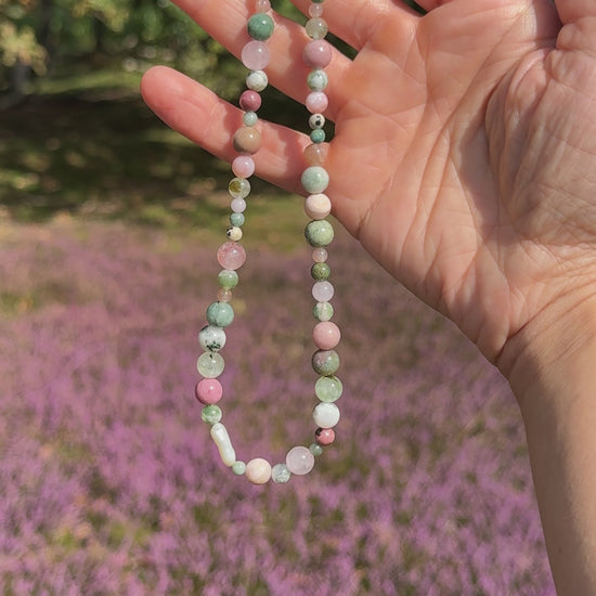 Diese naturinspirierte Perlenkette vereint eine harmonische Auswahl aus Rhodonit, rosa Anden-Opal, Prehnit, Baumachat, Rosenquarz, Eisenquarz, Mondstein, Myanmar-Jade und Rhyolit, veredelt durch eine elegante längliche Süßwasserperle. Die sanften Rosé-, Grün- und Erdtöne spiegeln die Schönheit der Natur wider und bringen gleichzeitig positive Energie in Ihren Alltag.