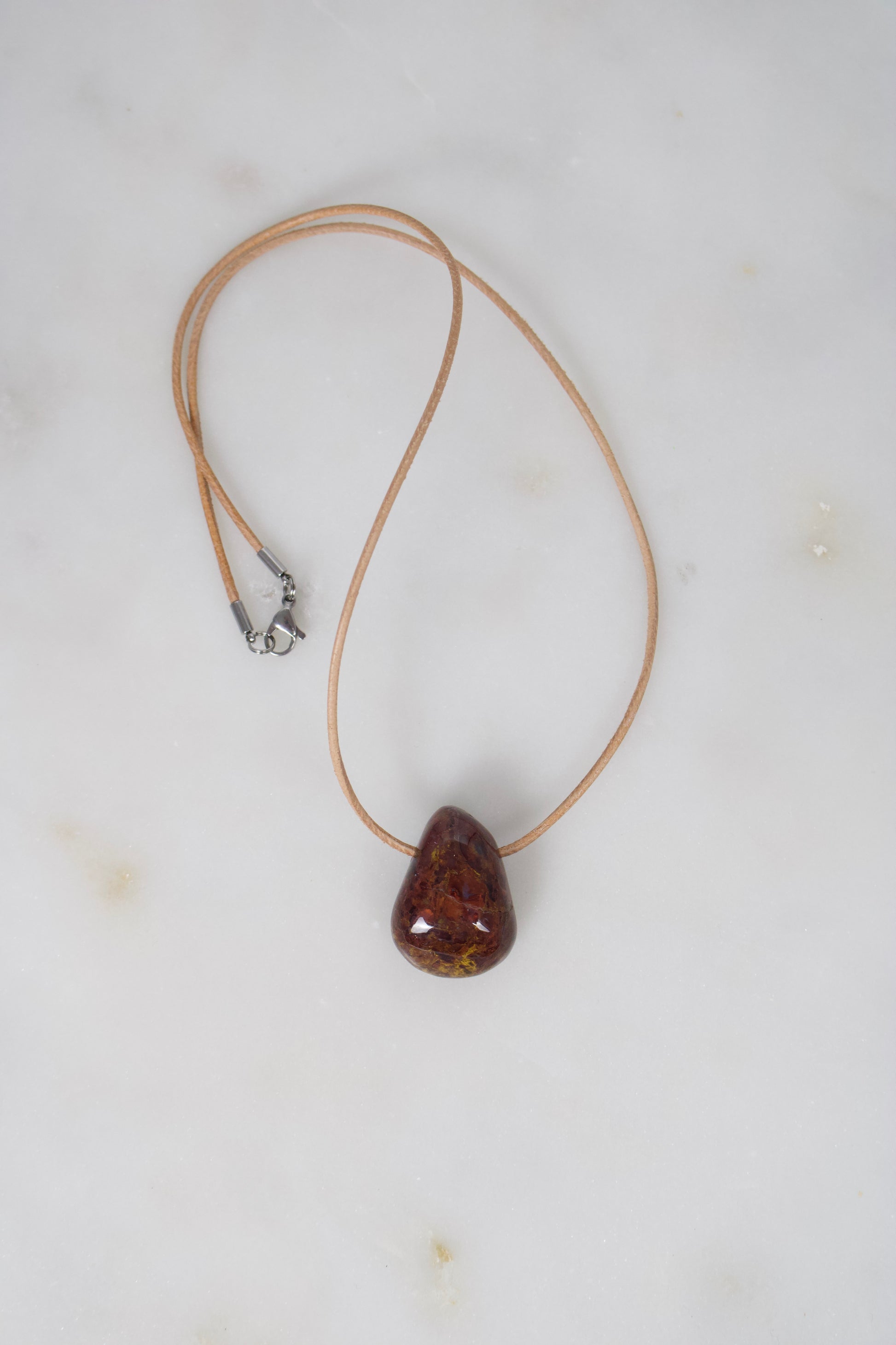 Getragen an einem Lederband nach Wahl, dessen Länge individuell bestimmt werden kann, wird der Anhänger durch einen Edelstahl-Karabiner in Silber- oder Goldoptik abgerundet.