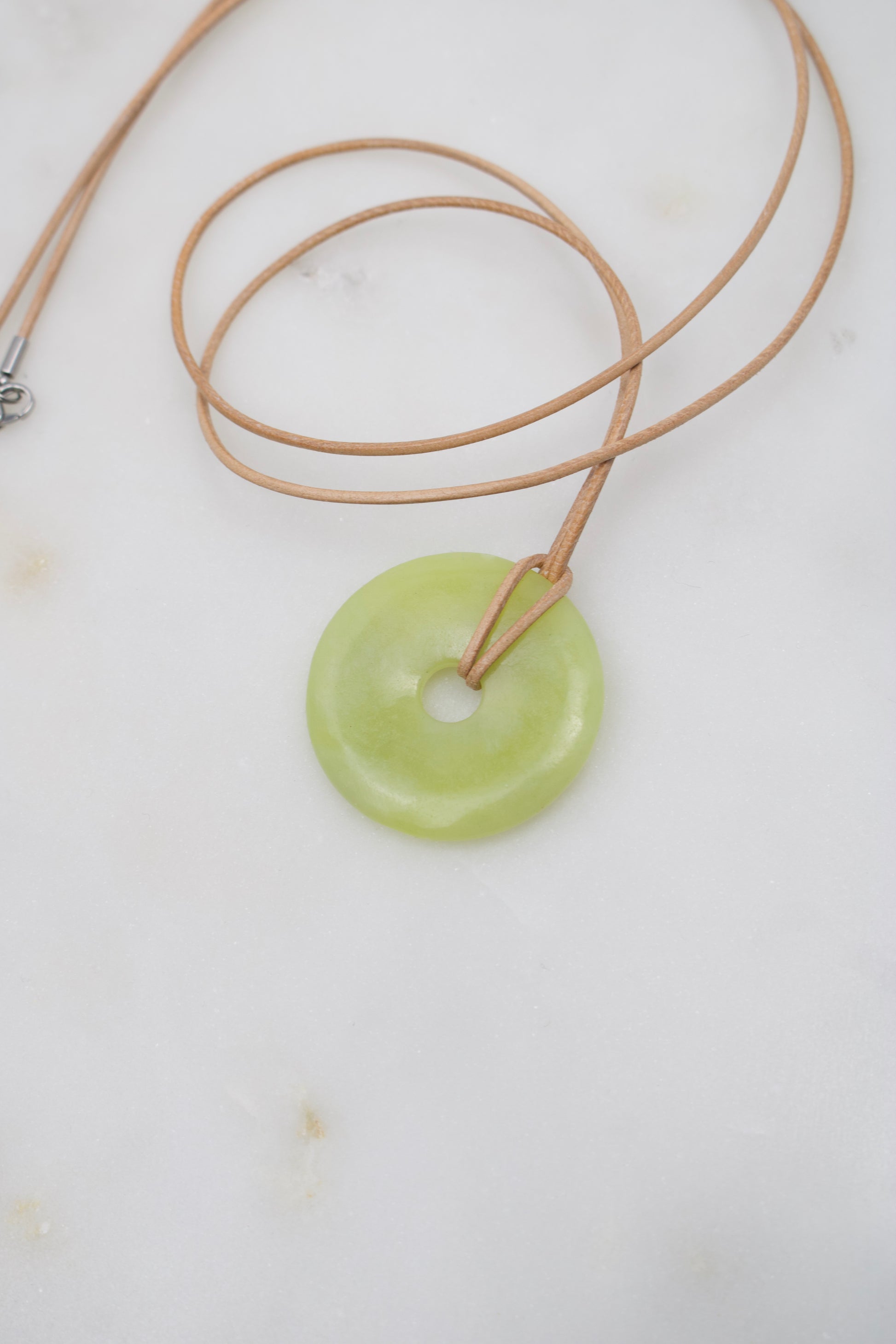 Getragen wird der Donut an einem Lederband nach Wahl – die Länge kann individuell bestimmt werden. Abgerundet wird das Schmuckstück durch einen Edelstahlverschluss in Silber- oder Goldoptik.