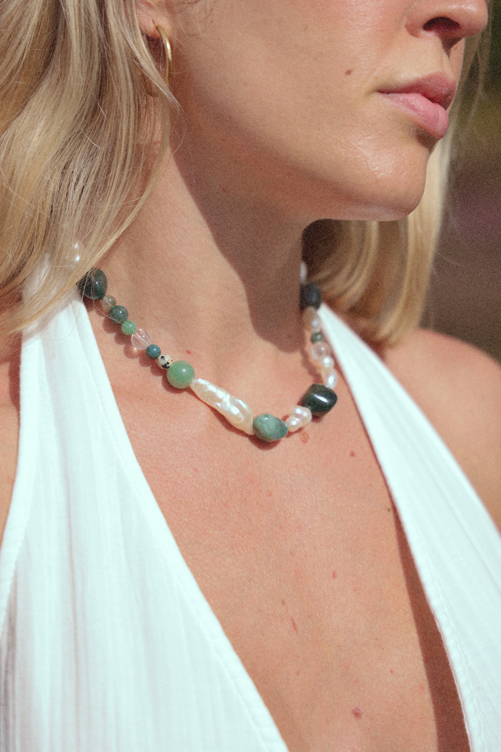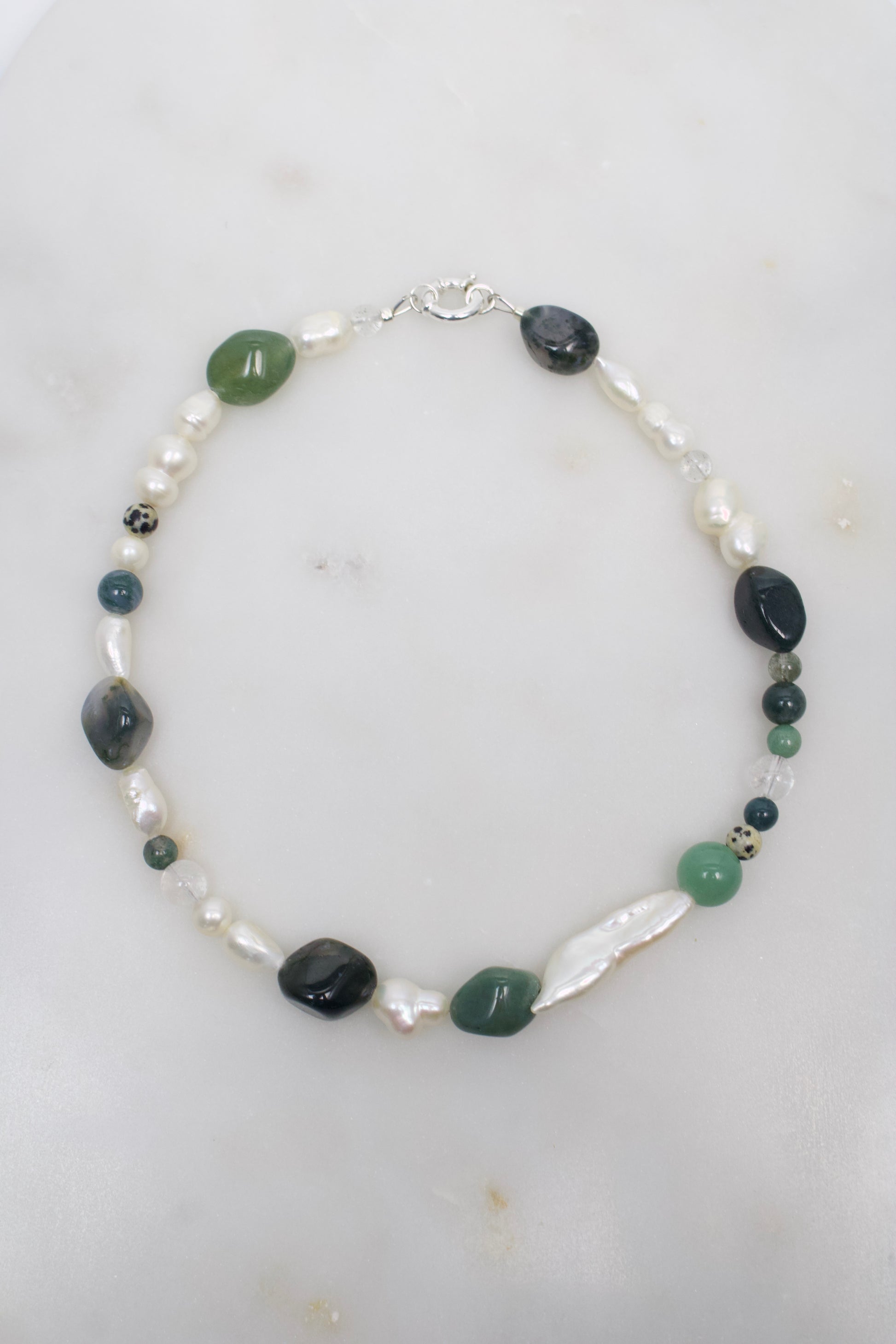 • Materialien: Süßwasserperlen, Moosachat, Aventurin, Bergkristall, Phantomquarz
