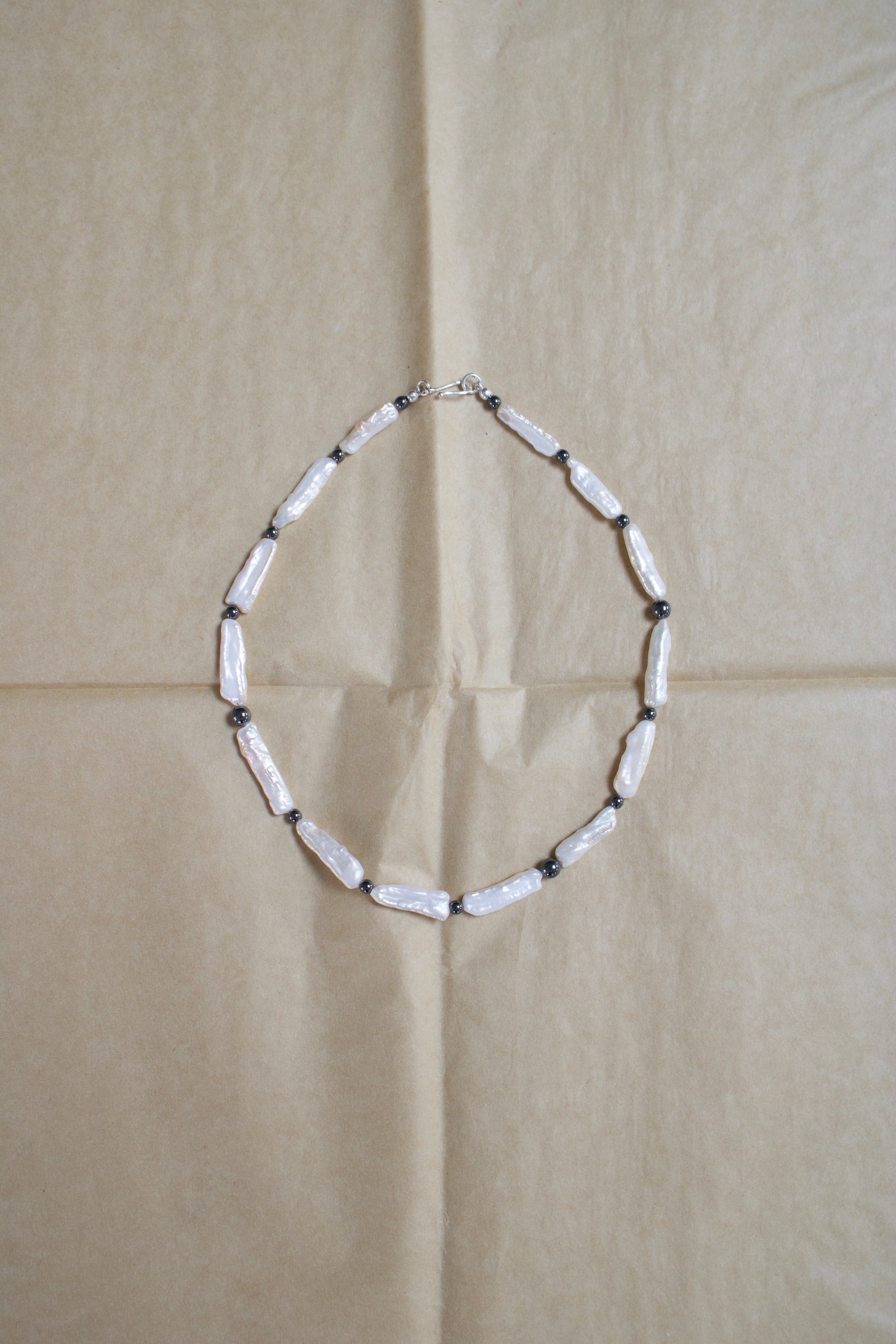 Diese elegante Halskette verbindet die natürliche Schönheit länglicher Süßwasserperlen mit der klaren, metallischen Ausstrahlung von Hämatit. Die sanft schimmernden Perlen bringen Leichtigkeit und zeitlose Eleganz, während die dunklen Hämatitperlen einen ruhigen, kraftvollen Kontrast setzen. Zusammen entsteht eine harmonische Komposition aus weichen und klaren Elementen, die der Kette eine moderne und zugleich natürliche Ausstrahlung verleiht.